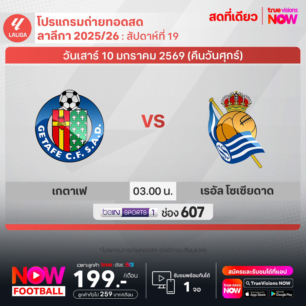 Getafe vs Real Sociedad เวลา 03.00-05.00 ทางช่อง beIN 1 (607)