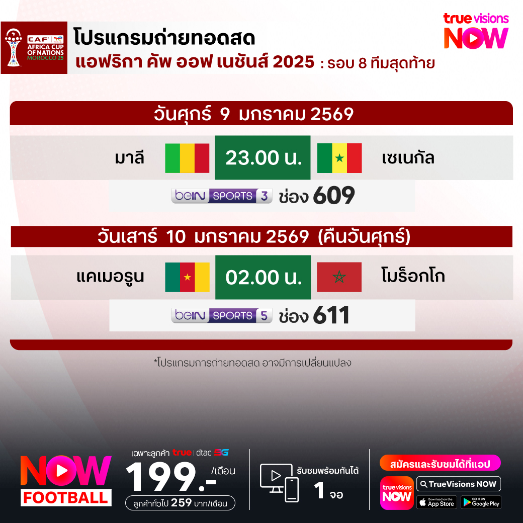วันนี้มีอะไรดูที่ ทรูวิชั่นส์ ประจำวันศุกร์ที่ 9 มกราคม 69 ยังคงมีกีฬาที่น่าสนใจให้ได้ตามลุ้นตามเชียร์กันเหมือนเดิม โดยในส่วนของฟุตบอลนั้น ยังมีศึก แอฟริกา คัพ ออฟ เนชั่นส์ รอบก่อนรองชนะเลิศฯ, ลา ลีกา สเปน, บุนเดสลีกา เยอรมนี, เอ-ลีก ออสเตรเลีย และ ซาอุดิ โปร ลีก ให้ได้ตามเชียร์กันต่อ ส่วนกีฬาอื่นๆ ยังมี ลิฟ กอล์ฟ โปรโมชั่นส์, เทนนิสหญิง ดับเบิ้ลยูทีเอ ทัวร์ รายการ บริสเบน อินเตอร์เนชั่นแนล, แบดมินตัน บีดับเบิ้ลยูเอฟ รายการ มาเลเซีย โอเพ่น, วอลเลย์บอล วี-ลีก และ วอลเลย์บอล ไทยแลนด์ ลีก งานนี้ ทรูวิชั่นส์ จัดเต็มให้ชมกันถึงบ้าน