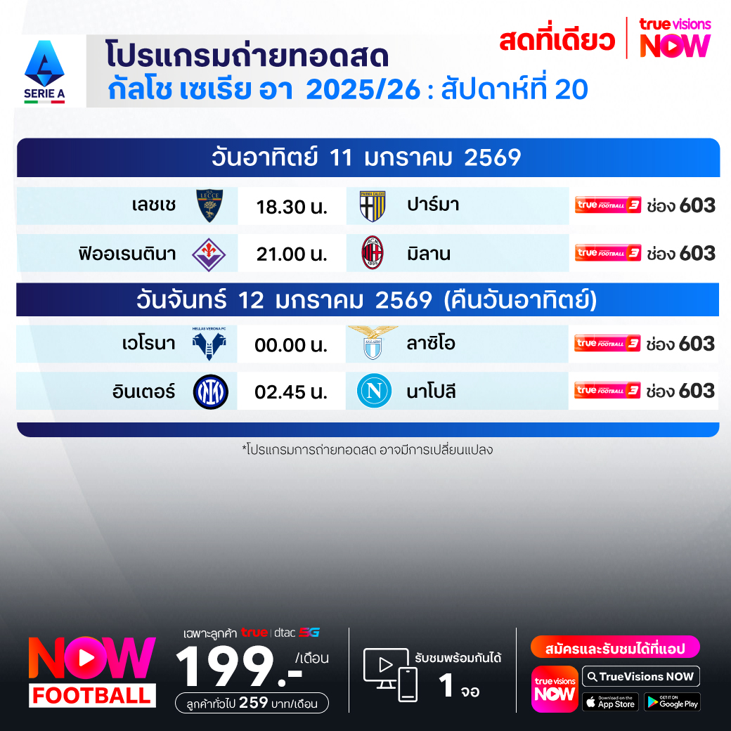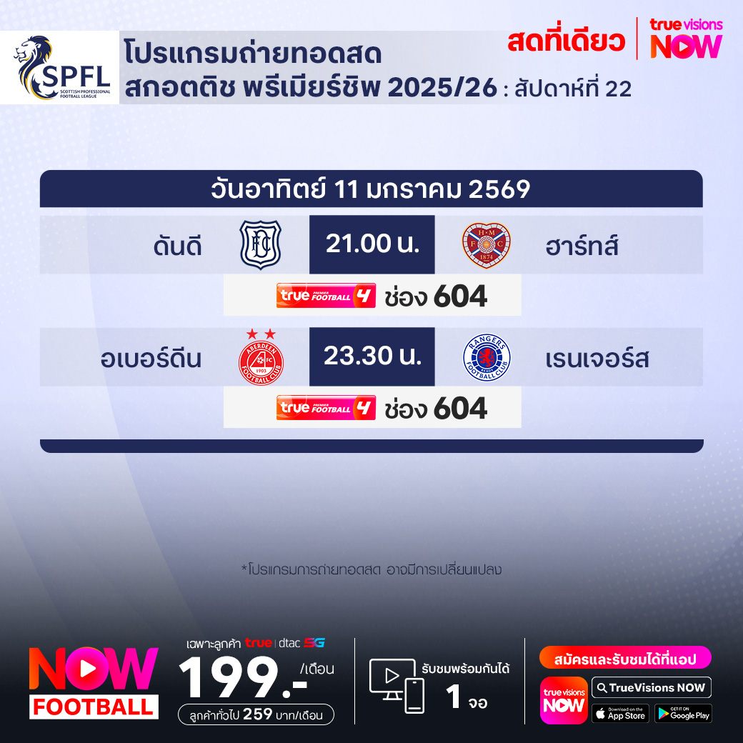 วันนี้มีอะไรดูที่ ทรูวิชั่นส์ ประจำวันอาทิตย์ที่ 11 มกราคม 69 ยังคงมีกีฬาที่น่าสนใจให้ได้ตามลุ้นตามเชียร์กันเหมือนเดิม โดยในส่วนของฟุตบอลนั้น ยังมีศึก ลา ลีกา สเปน, บุนเดสลีกา เยอรมนี, กัลโช่ เซเรีย อา อิตาลี, สกอตติช พรีเมียร์ชิพ และ เอ-ลีก ออสเตรเลีย ให้ได้ตามเชียร์กันต่อ ส่วนกีฬาอื่นๆ ยังมี ลิฟ กอล์ฟ โปรโมชั่นส์, เทนนิสหญิง ดับเบิ้ลยูทีเอ ทัวร์ รายการ บริสเบน อินเตอร์เนชั่นแนล, แบดมินตัน บีดับเบิ้ลยูเอฟ รายการ มาเลเซีย โอเพ่น, เวิลด์ สนุกเกอร์ ทัวร์ รายการ จอห์นสโตนส์ เพนท์ มาสเตอร์ส และ วอลเลย์บอล วี-ลีก งานนี้ ทรูวิชั่นส์ จัดเต็มให้ชมกันถึงบ้าน