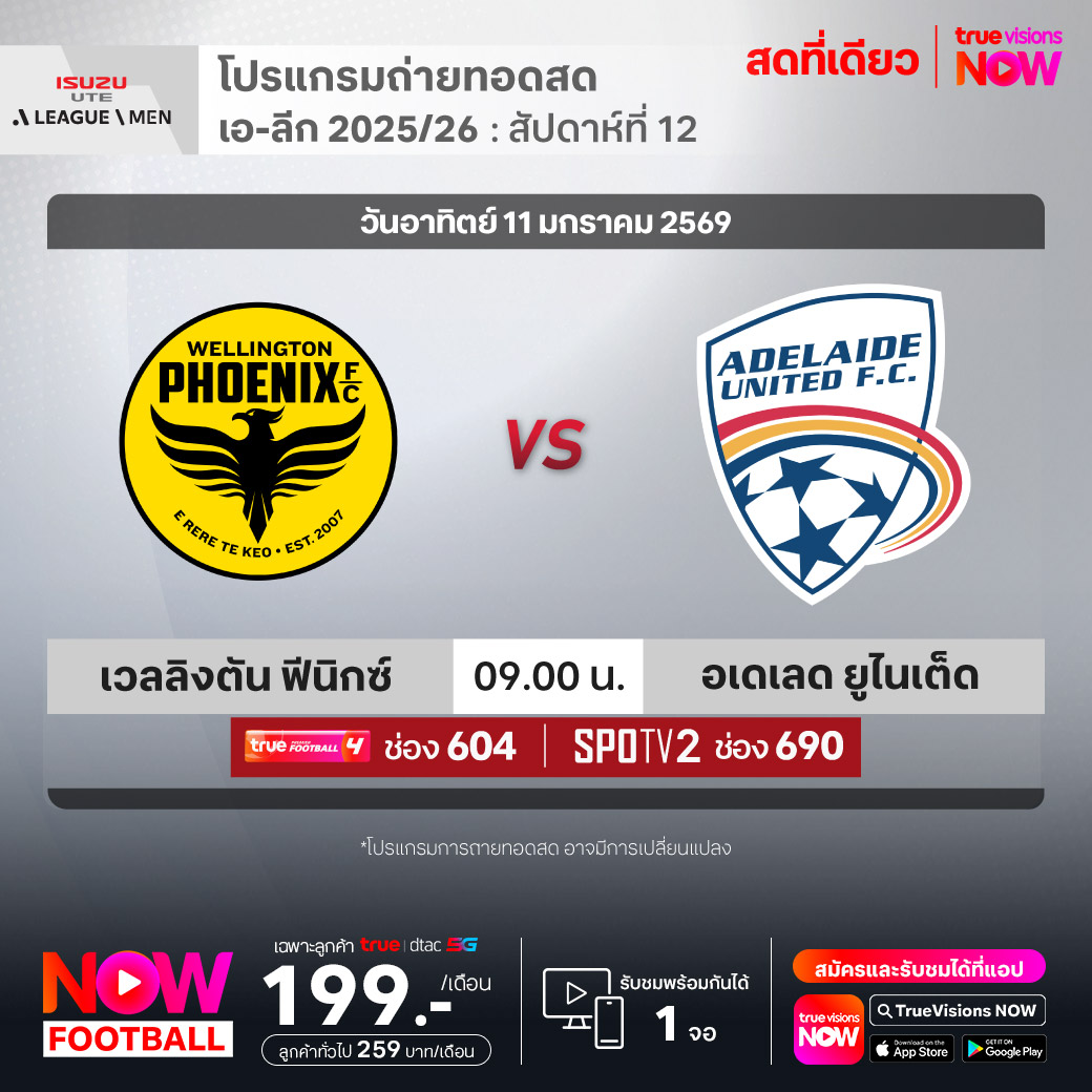 Wellington Phoenix vs Adelaide United เวลา 09.00-11.00 ทางช่องTPF 4(604) / SPOTV2 (690)