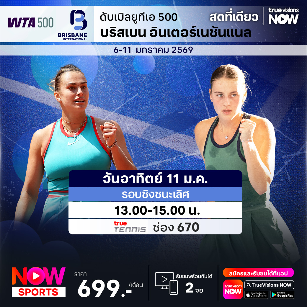 เทนนิสหญิง ดับเบิ้ลยูทีเอ ทัวร์ รายการแรกของปี 2026 ได้เริ่มขึ้นอย่างเป็นทางการแล้ว กับรายการ บริสเบน อินเตอร์แนชั่นแนล รายการระดับ WTA 500 นำโดย อารีนา ซาบาเลนก้า นักเทนนิสมือวางอันดับ 1 ของโลก, อแมนด้า อนิซิโมวา นักหวดสาวชาวอเมริกัน และ เอลินา รีบาคินา นักเทนนิสชื่อดังอดีตแชมป์ระดับแกรนด์สแลม ร่วมลุ้นว่าใครจะคว้าแชมป์ไปครอง ชมสด ครบทุกรอบ ที่ ทรูวิชั่นส์