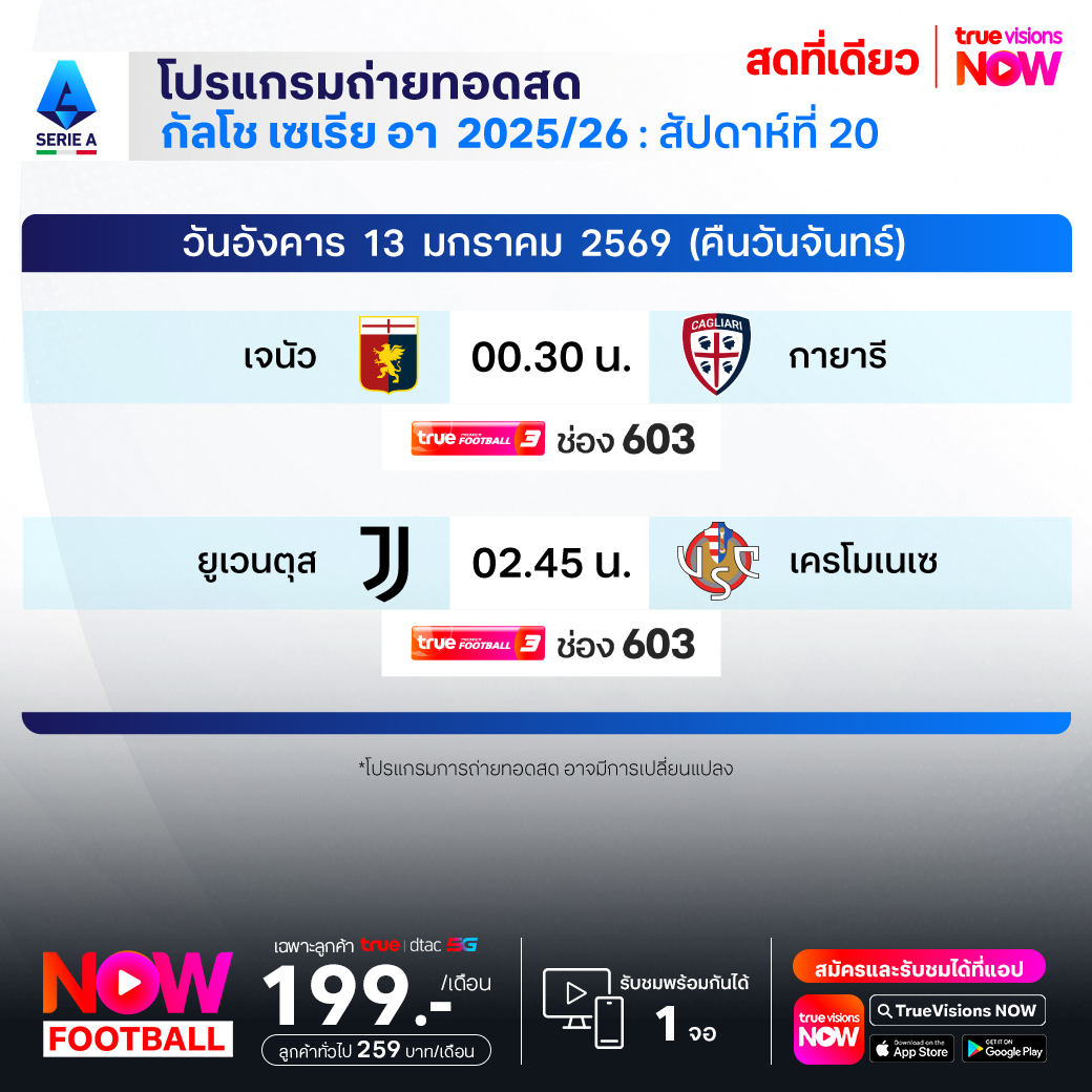 วันนี้มีอะไรดูที่ ทรูวิชั่นส์ ประจำวันจันทร์ที่ 12 มกราคม 69 ยังคงมีกีฬาที่น่าสนใจให้ได้ตามลุ้นตามเชียร์กันเหมือนเดิม โดยในส่วนของฟุตบอลนั้น ยังมีศึก ลา ลีกา สเปน, กัลโช่ เซเรีย อา อิตาลี และ ซาอุดิ โปร ลีก ให้ได้ตามเชียร์กันต่อ ส่วนกีฬาอื่นๆ ยังมี เทนนิสหญิง ดับเบิ้ลยูทีเอ ทัวร์ รายการ อเดเลด อินเตอร์เนชั่นแนล และ เวิลด์ สนุกเกอร์ ทัวร์ รายการ จอห์นสโตนส์ เพนท์ มาสเตอร์ส งานนี้ ทรูวิชั่นส์ จัดเต็มให้ชมกันถึงบ้าน