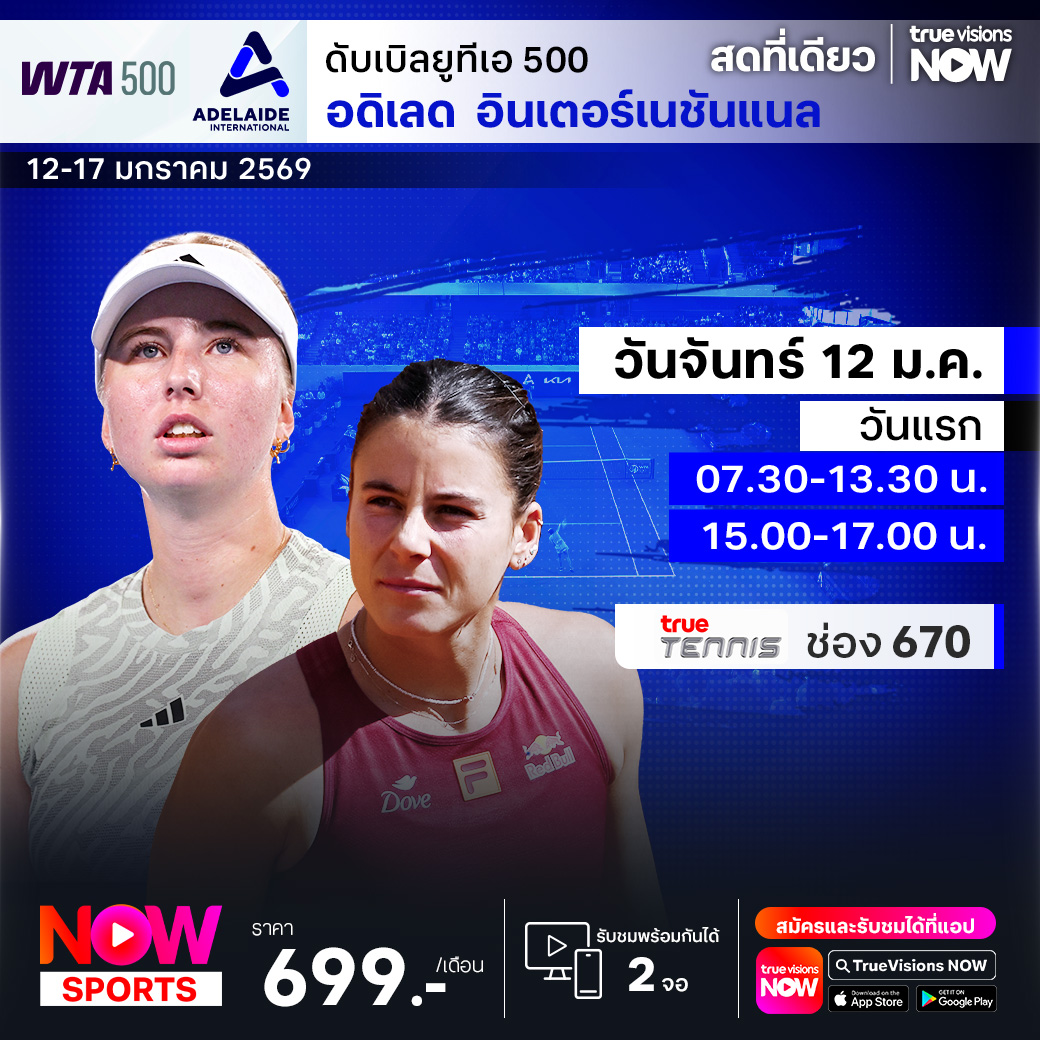 เทนนิสหญิงรายการที่ 2 ของปี แข่งขันกันที่ออสเตรเลียอย่างต่อเนื่อง ในรายการระดับ WTA 500 อเดเลด อินเตอร์เนชั่นแนล บรรดานักเทนนิสหญิงระดับโลกเข้าร่วมการแข่งขันแบบจัดเต็ม เพื่อเตรียมตัวก่อนแกรนด์สแลมแรกของปี ออสเตรเลียน โอเพ่น ร่วมลุ้นกันว่าใครจะคว้าแชมป์ในรายการนี้ไปครอง ชมสด ครบทุกรอบ ที่ ทรูวิชั่นส์