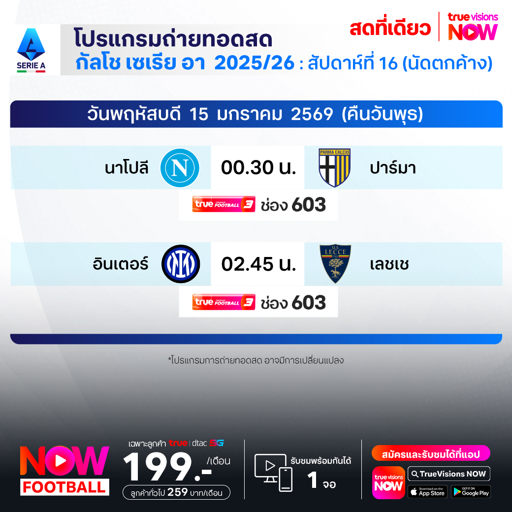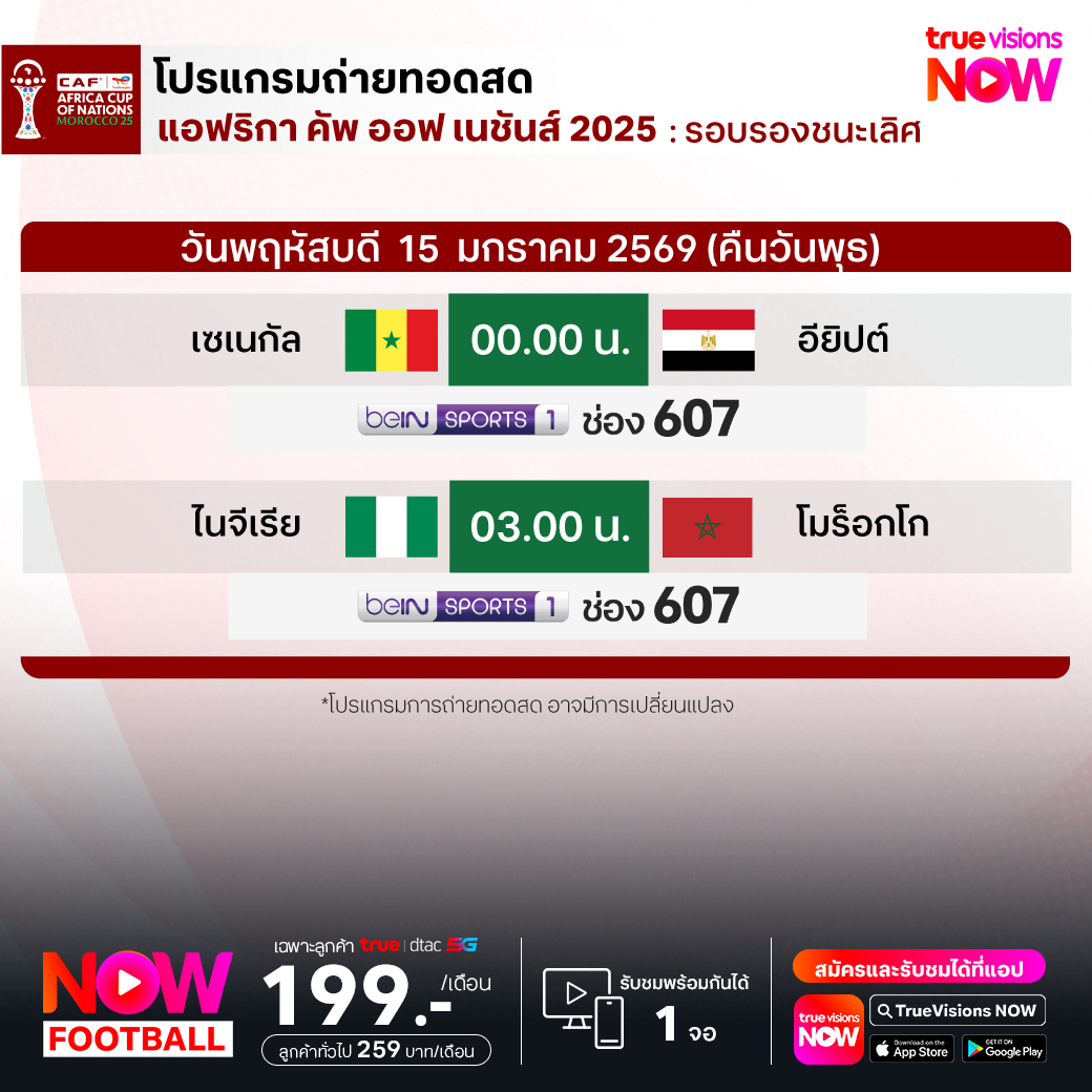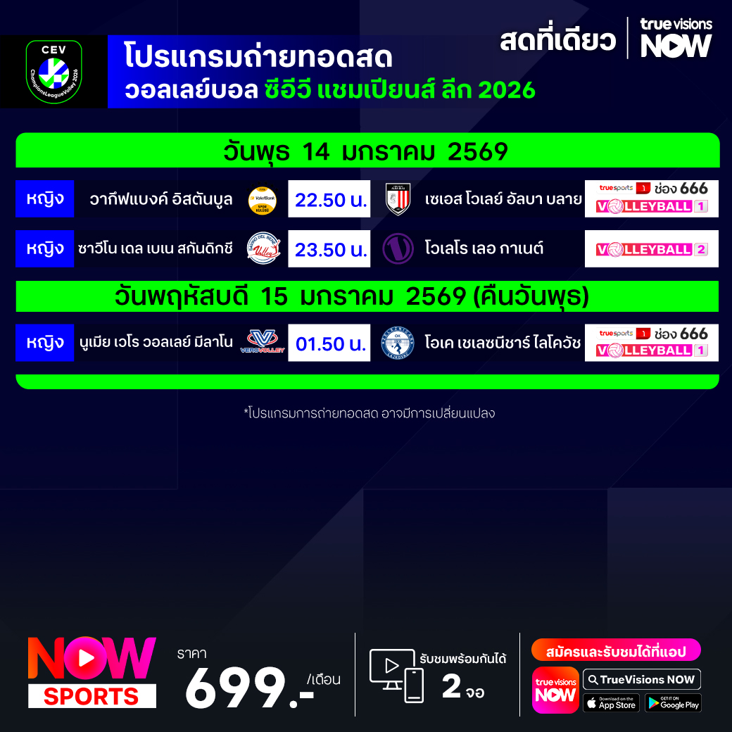 วันนี้มีอะไรดูที่ ทรูวิชั่นส์ ประจำวันพุธที่ 14 มกราคม 69 ยังคงมีกีฬาที่น่าสนใจให้ได้ตามลุ้นตามเชียร์กันเหมือนเดิม โดยในส่วนของฟุตบอลนั้น ยังมีศึก แอฟริกา คัพ ออฟ เนชั่นส์ รอบรองชนะเลิศ, บุนเดสลีกา เยอรมนี, กัลโช่ เซเรีย อา อิตาลี, สกอตติช พรีเมียร์ชิพ และ ซาอุดิ โปร ลีก ให้ได้ตามเชียร์กันต่อ ส่วนกีฬาอื่นๆ ยังมี เทนนิสหญิง ดับเบิ้ลยูทีเอ ทัวร์ รายการ อเดเลด อินเตอร์เนชั่นแนล, เทนนิส คูยอง คลาสสิก, กอล์ฟ ทูมอร์โรว์ส กอล์ฟ ลีก, เวิลด์ สนุกเกอร์ ทัวร์ รายการ จอห์นสโตนส์ เพนท์ มาสเตอร์ส, แบดมินตัน บีดับเบิ้ลยูเอฟ รายการ อินเดีย โอเพ่น, วอลเลย์บอล ซีอีวี แชมเปี้ยนชิพ ลีก และ วี-ลีก งานนี้ ทรูวิชั่นส์ จัดเต็มให้ชมกันถึงบ้าน