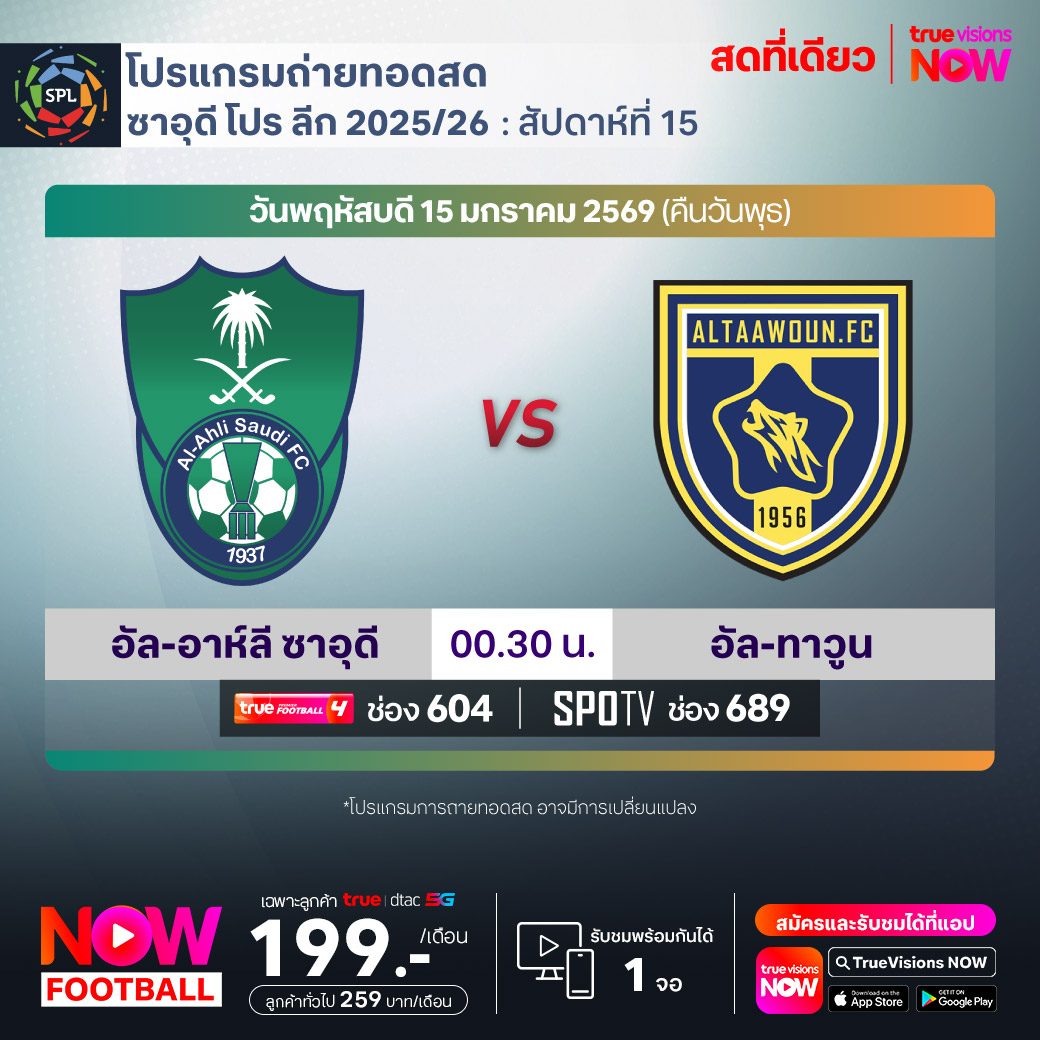 Al Ahli vs Al Taawoun เวลา 00.30-02.30 ทางช่องTPF 4(604) / SPOTV (689)