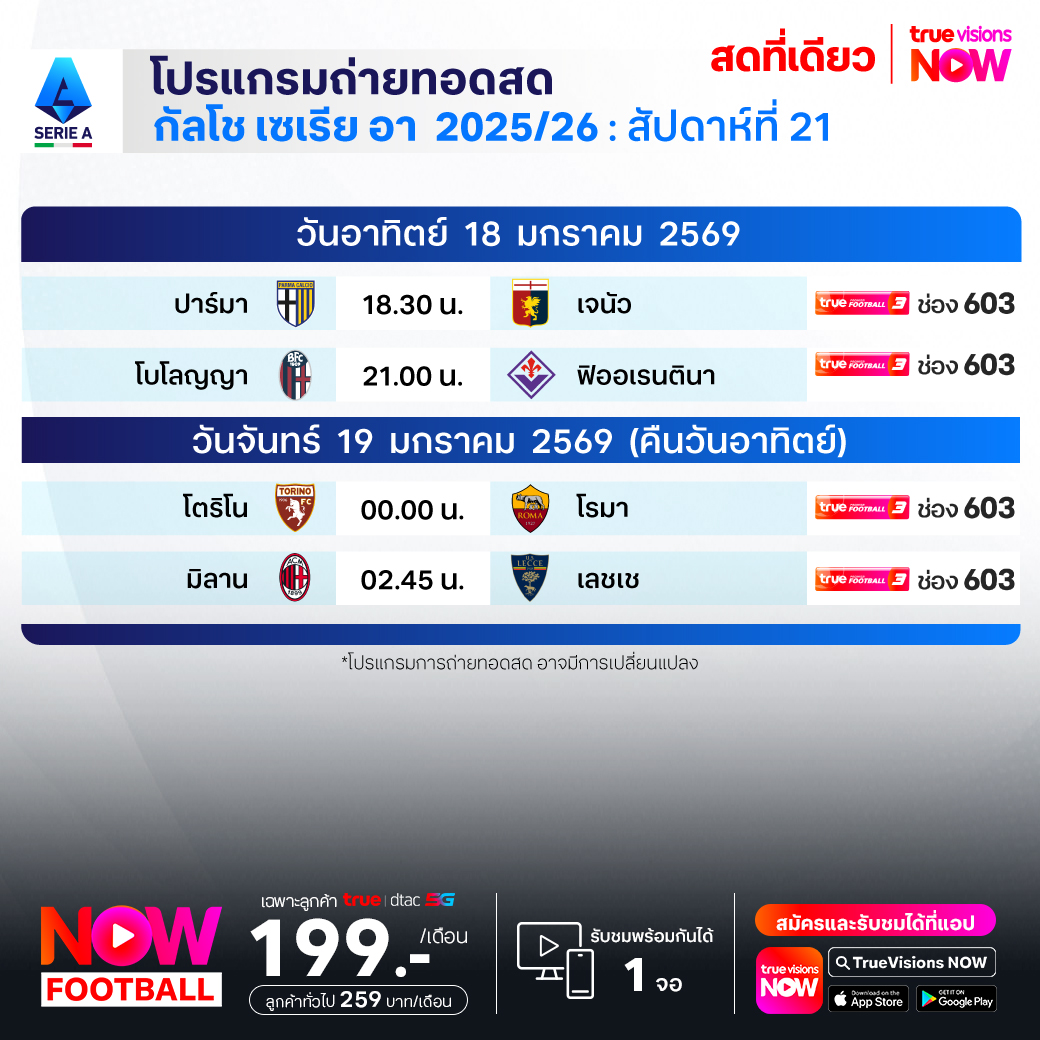 Parma vs Genoa เวลา 18.30-20.30 ทางช่องTPF 3(603)