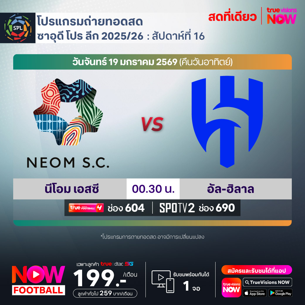 Neom vs Al Hilal เวลา 00.30-02.30 ทางช่องTPF 4(604) / SPOTV2 (690)