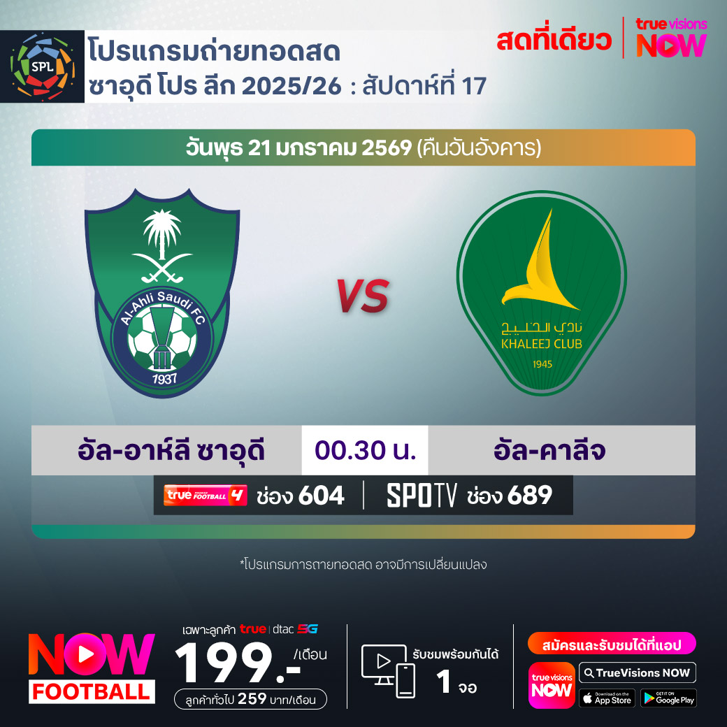 Al Ahli vs Al Khaleej เวลา 00.30-02.30 ทางช่องTPF 4(604) / SPOTV (689)