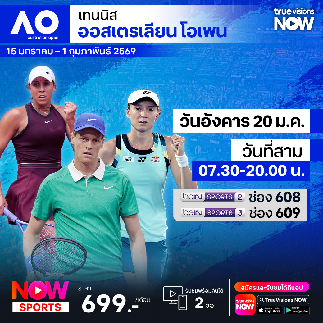 ศึกเทนนิส ออสเตรเลียน โอเพ่น แกรนด์สแลมแรกของปี 2026 เริ่มต้นอีกครั้ง กับการแข่งขันในสภาพอากาศที่ร้อนจัดของเมืองเมลเบิร์น ประเทศออสเตรเลีย แชมป์เก่า ยานนิค ซินเนอร์ ลงป้องกันแชมป์อีกครั้ง ร่วมด้วย คาร์ลอส อัลคาราซ และ โนวัค ยอโชวิช ส่วนในประเภทหญิงเดี่ยว ม้ามืดในปีก่อน เมดิสัน คีย์ ลงป้องกันแชมป์ พร้อมชนกับนักเทนนิสหญิงชื่อดังทั้ง อารีนา ซาบาเลนกา และ อิกา ซิออนเทค ร่วมลุ้นว่าใครจะคว้าแชมป์ไปครองทั้งประเภทชายและประเภทหญิง ชมสด ครบทุกรอบ ที่ ทรูวิชั่นส์