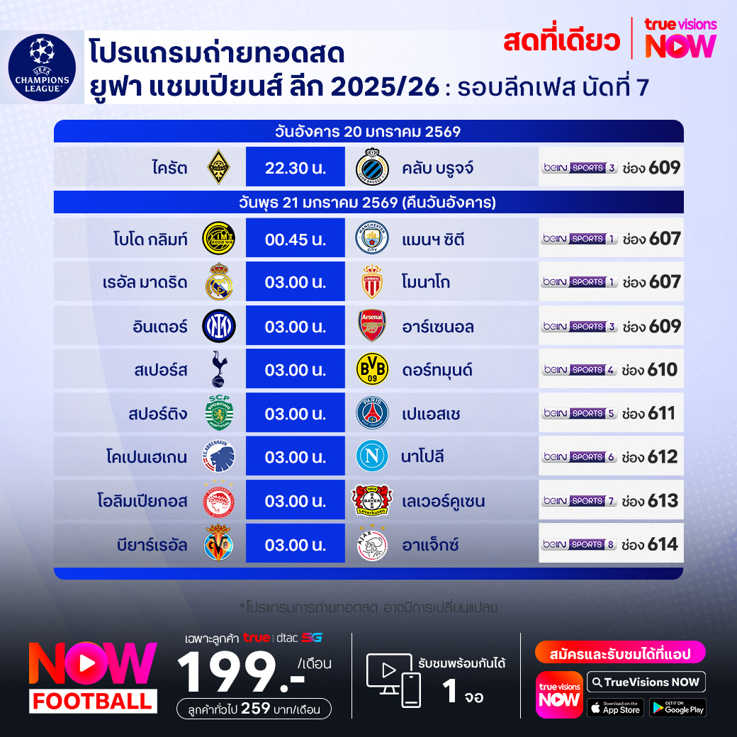 วันนี้มีอะไรดูที่ ทรูวิชั่นส์ ประจำวันอังคารที่ 20 มกราคม 69 ยังคงมีกีฬาที่น่าสนใจให้ได้ตามลุ้นตามเชียร์กันเหมือนเดิม โดยในส่วนของฟุตบอลนั้น ยังมีศึก ยูฟ่า แชมเปี้ยนส์ ลีก และ ซาอุดิ โปร ลีก ให้ได้ตามเชียร์กันต่อ ส่วนกีฬาอื่นๆ พลาดไม่ได้กับพิธีเปิดการแข่งขันกีฬา อาเซียนพาราเกมส์ 2025, ศึกเทนนิสออสเตรเลียน โอเพ่น แกรนด์สแลมแรกของปี และ วอลเลย์บอล วี-ลีก งานนี้ ทรูวิชั่นส์ จัดเต็มให้ชมกันถึงบ้าน
