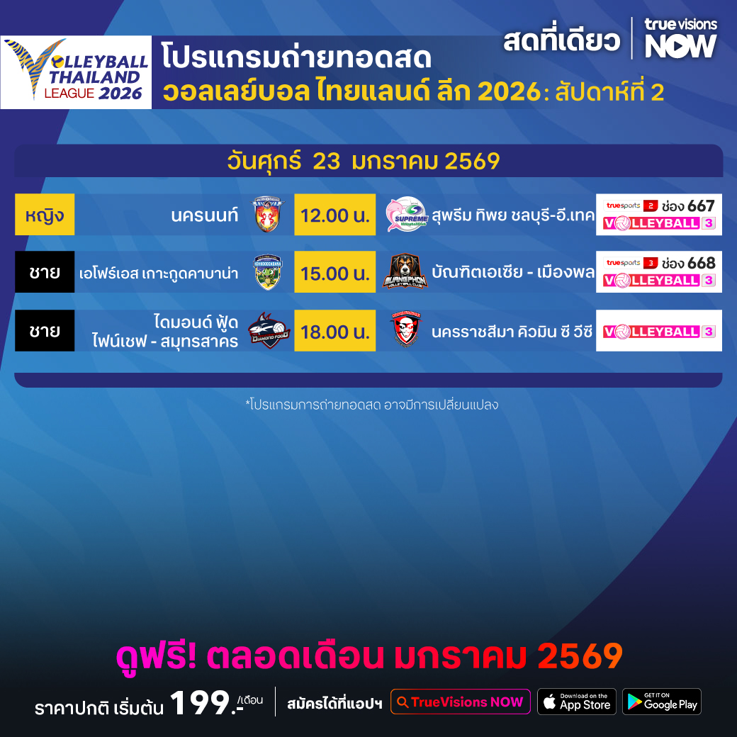 วันนี้มีอะไรดูที่ ทรูวิชั่นส์ ประจำวันศุกร์ที่ 23 มกราคม 69 ยังคงมีกีฬาที่น่าสนใจให้ได้ตามลุ้นตามเชียร์กันเหมือนเดิม โดยในส่วนของฟุตบอลนั้น ยังมีศึก ลา ลีกา สเปน, บุนเดสลีกา เยอรมนี, กัลโช่ เซเรีย อา อิตาลี และ เอ-ลีก ออสเตรเลีย ให้ได้ตามเชียร์กันต่อ ส่วนกีฬาอื่นๆ พลาดไม่ได้กับการแข่งขันกีฬาอาเซียนพาราเกมส์ 2025, ศึกเทนนิสออสเตรเลียน โอเพ่น แกรนด์สแลมแรกของปี, แบดมินตัน บีดับเบิ้ลยูเอฟ รายการ อินโดนีเซีย มาสเตอร์ส, วอลเลย์บอล วี-ลีก และ วอลเลย์บอล ไทยแลนด์ ลีก งานนี้ ทรูวิชั่นส์ จัดเต็มให้ชมกันถึงบ้าน
