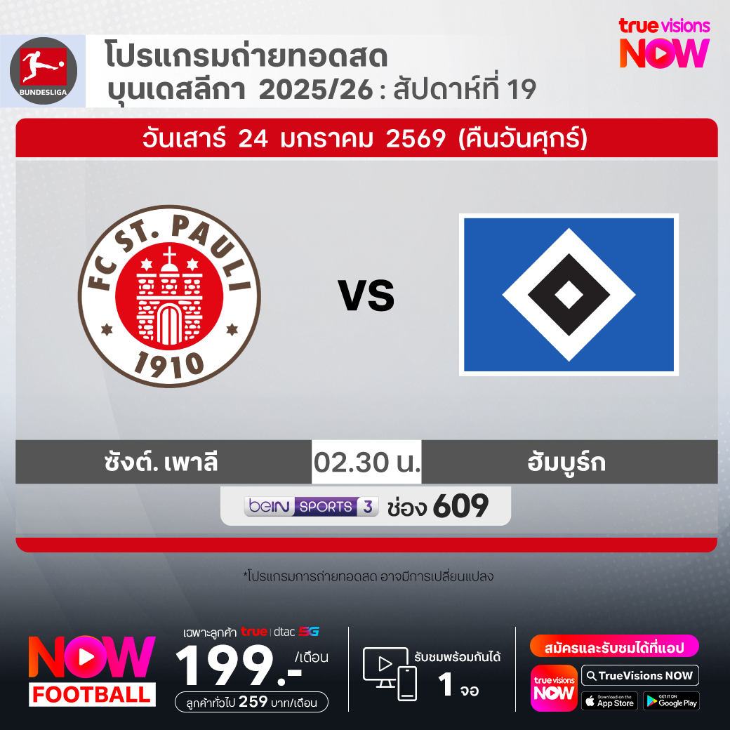 St. Pauli vs Hamburg เวลา 02.30-04.30 ทางช่อง beIN 3 (609)