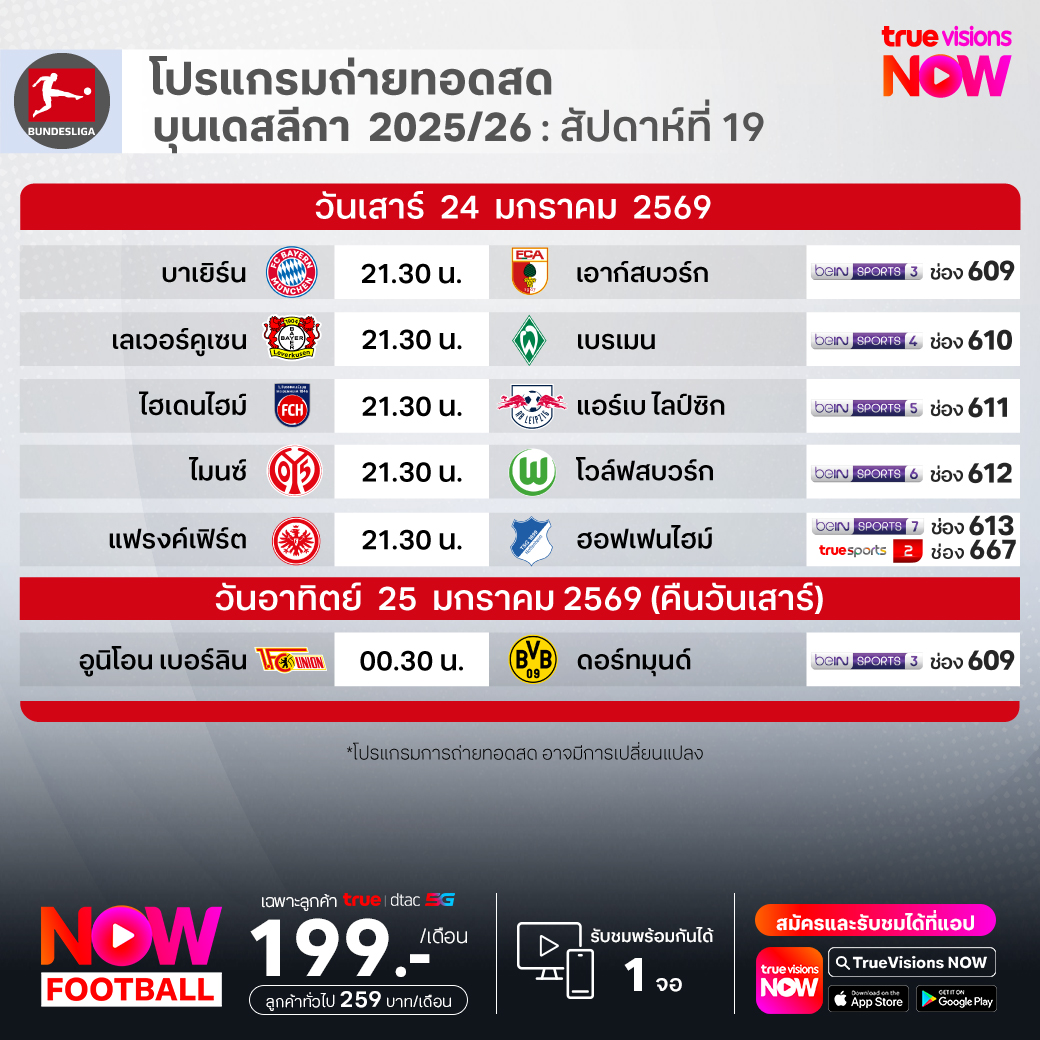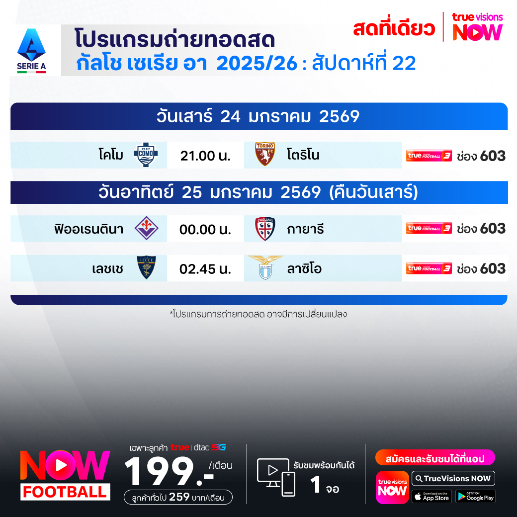 วันนี้มีอะไรดูที่ ทรูวิชั่นส์ ประจำวันเสาร์ที่ 24 มกราคม 69 ยังคงมีกีฬาที่น่าสนใจให้ได้ตามลุ้นตามเชียร์กันเหมือนเดิม โดยในส่วนของฟุตบอลนั้น ยังมีศึก ลา ลีกา สเปน, บุนเดสลีกา เยอรมนี, กัลโช่ เซเรีย อา อิตาลี และ เอ-ลีก ออสเตรเลีย ให้ได้ตามเชียร์กันต่อ ส่วนกีฬาอื่นๆ พลาดไม่ได้กับการแข่งขันกีฬาอาเซียนพาราเกมส์ 2025, ศึกเทนนิสออสเตรเลียน โอเพ่น แกรนด์สแลมแรกของปี, แบดมินตัน บีดับเบิ้ลยูเอฟ รายการ อินโดนีเซีย มาสเตอร์ส และ วอลเลย์บอล ไทยแลนด์ ลีก งานนี้ ทรูวิชั่นส์ จัดเต็มให้ชมกันถึงบ้าน