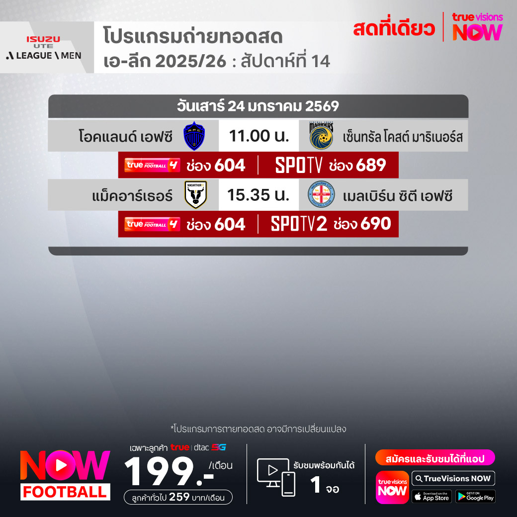Auckland FC vs Central Coast Mariners FC เวลา 11.00-13.00 ทางช่องTPF 4(604) / SPOTV (689)