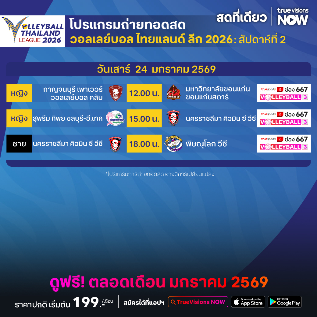 กาญจนบุรี เพาเวอร์ วอลเลย์บอล คลับ พบ มหาวิทยาลัยขอนแก่น ขอนแก่นสตาร์ เวลา 12.00 ทางช่อง TS 2 (667) / Volleyball 3