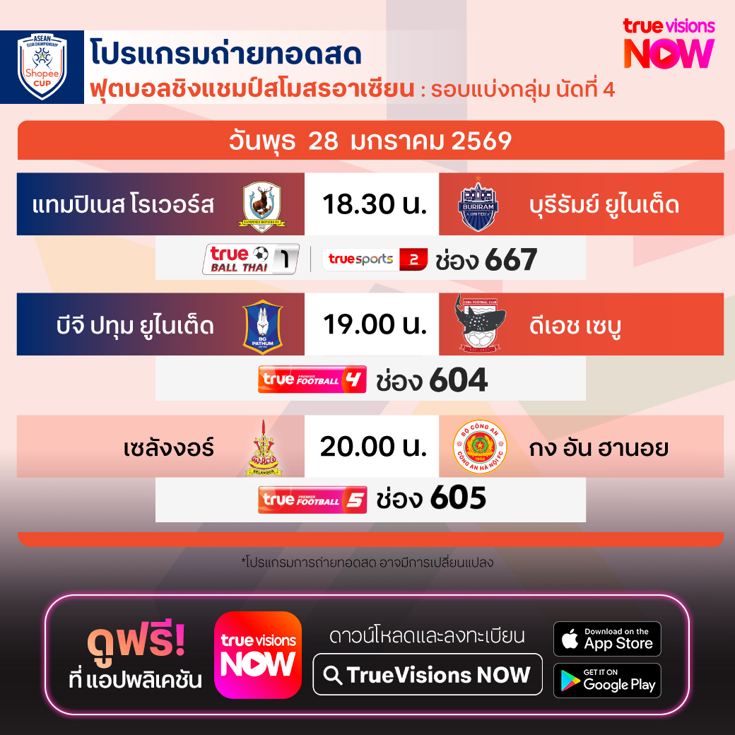 แทมปิเนส โรเวอร์ส พบ บุรีรัมย์ ยูไนเต็ด เวลา 18.30-20.30 ทางช่อง True Ball Thai 1 / TS 2 (667)