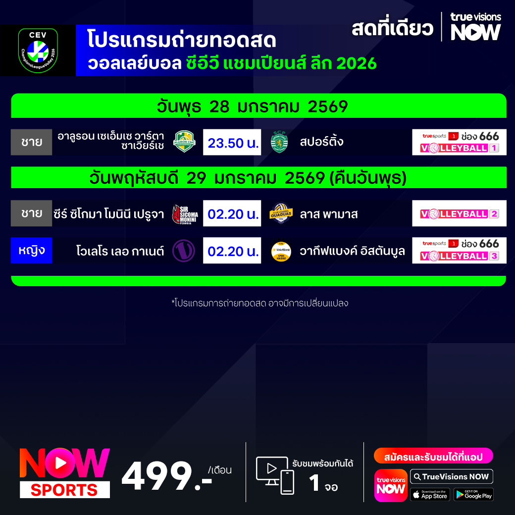 อาลูรอน เซเอ็มเซ วาร์ตา ซาเวียร์เช พบ สปอร์ติ้ง เวลา 23.50 ทางช่อง TS 1 (666)/Volleyball 1