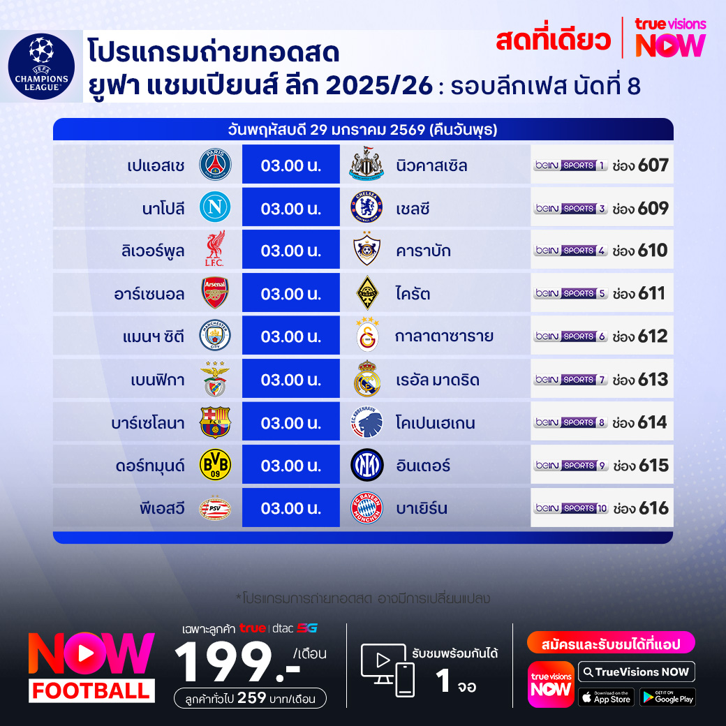 วันนี้มีอะไรดูที่ ทรูวิชั่นส์ ประจำวันพุธที่ 28 มกราคม 69 ยังคงมีกีฬาที่น่าสนใจให้ได้ตามลุ้นตามเชียร์กันเหมือนเดิม โดยในส่วนของฟุตบอลนั้น ยังมีศึก ยูฟ่า แชมเปี้ยนส์ ลีก รอบ ลีก เฟส, ซาอุดิ โปร ลีก และ ฟุตบอลชิงแชมป์สโมสรอาเซียน ให้ได้ตามเชียร์กันต่อ ส่วนกีฬาอื่นๆ พลาดไม่ได้กับศึกเทนนิสออสเตรเลียน โอเพ่น แกรนด์สแลมแรกของปี, เวิลด์ สนุกเกอร์ ทัวร์ รายการ เยอรมัน มาสเตอร์ส และ วอลเลย์บอล ซีอีวี แชมเปี้ยนส์ ลีก งานนี้ ทรูวิชั่นส์ จัดเต็มให้ชมกันถึงบ้าน