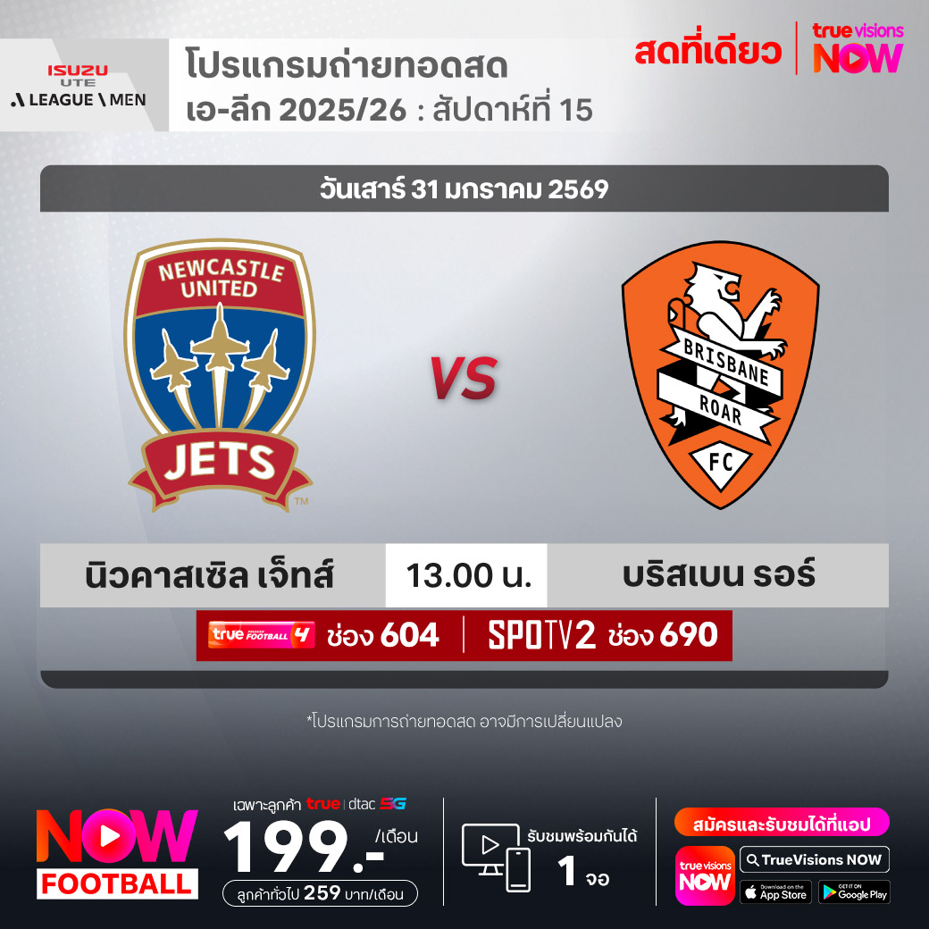Newcastle Jets FC vs Brisbane Roar FC เวลา 13.00-15.00 ทางช่องTPF 4(604) / SPOTV2 (690)