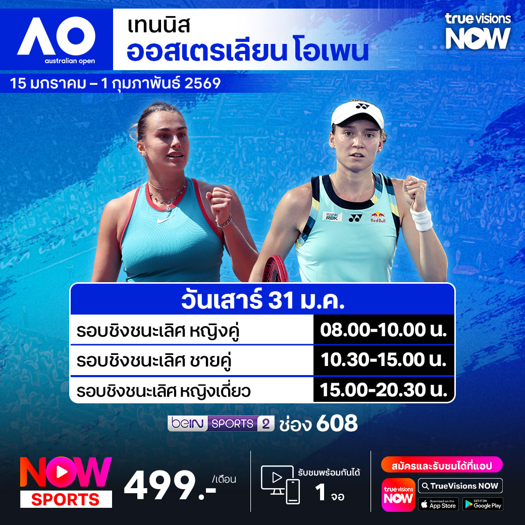 ศึกเทนนิส ออสเตรเลียน โอเพ่น แกรนด์สแลมแรกของปี 2026 เริ่มต้นอีกครั้ง กับการแข่งขันในสภาพอากาศที่ร้อนจัดของเมืองเมลเบิร์น ประเทศออสเตรเลีย เข้าสู่รอบชิงชนะเลิศ หญิงคู่/ชายคู่ และต่อด้วยรอบชิงชนะเลิศ หญิงเดี่ยว ร่วมลุ้นว่าใครจะคว้าแชมป์ไปครองทั้งประเภทชายและประเภทหญิง ชมสด ที่ ทรูวิชั่นส์