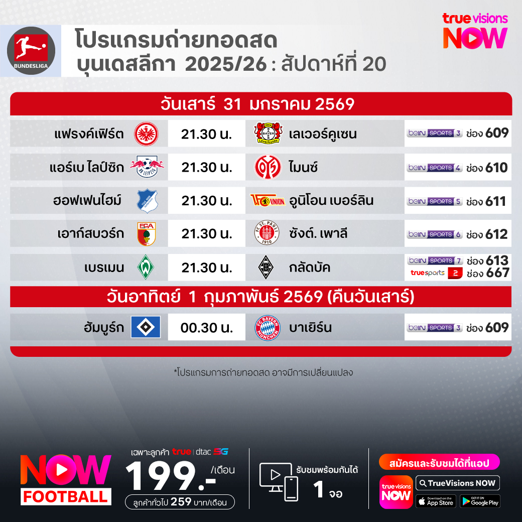 วันนี้มีอะไรดูที่ ทรูวิชั่นส์ ประจำวันเสาร์ที่ 31 มกราคม 69 ยังคงมีกีฬาที่น่าสนใจให้ได้ตามลุ้นตามเชียร์กันเหมือนเดิม โดยในส่วนของฟุตบอลนั้น ยังมีศึก ลา ลีกา สเปน, บุนเดสลีกา เยอรมนี, กัลโช่ เซเรีย อา อิตาลี, สกอตติช พรีเมียร์ชิพ, ลีกา 2 เยอรมนี และ เอ-ลีก ออสเตรเลีย ให้ได้ตามเชียร์กันต่อ ส่วนกีฬาอื่นๆ พลาดไม่ได้กับศึกเทนนิสออสเตรเลียน โอเพ่น แกรนด์สแลมแรกของปี, เวิลด์ สนุกเกอร์ ทัวร์ รายการ เยอรมัน มาสเตอร์ส, แบดมินตันบีดับเบิ้ลยูเอฟ รายการ ไทยแลนด์ มาสเตอร์ส, วอลเลย์บอล วี-ลีก และ วอลเลย์บอล ไทยแลนด์ ลีก งานนี้ ทรูวิชั่นส์ จัดเต็มให้ชมกันถึงบ้าน