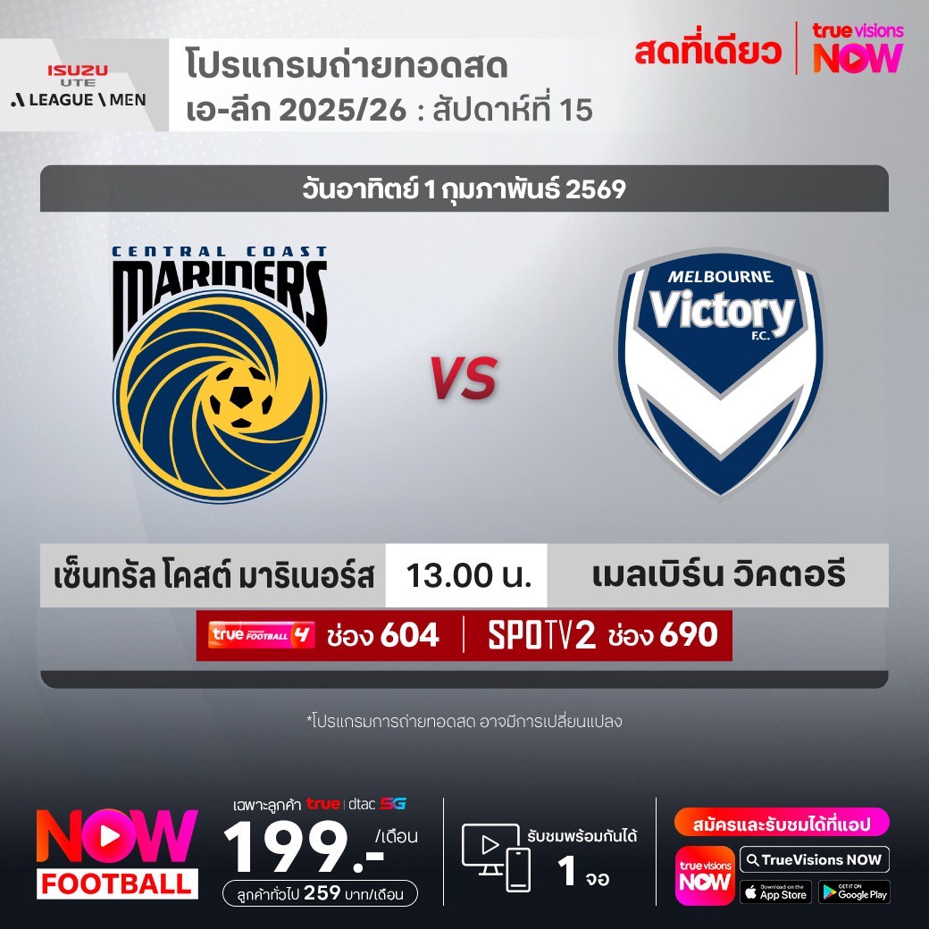 Central Coast Mariners FC vs Melbourne Victory เวลา 13.00-15.00 ทางช่องTPF 4(604) / SPOTV2 (690)