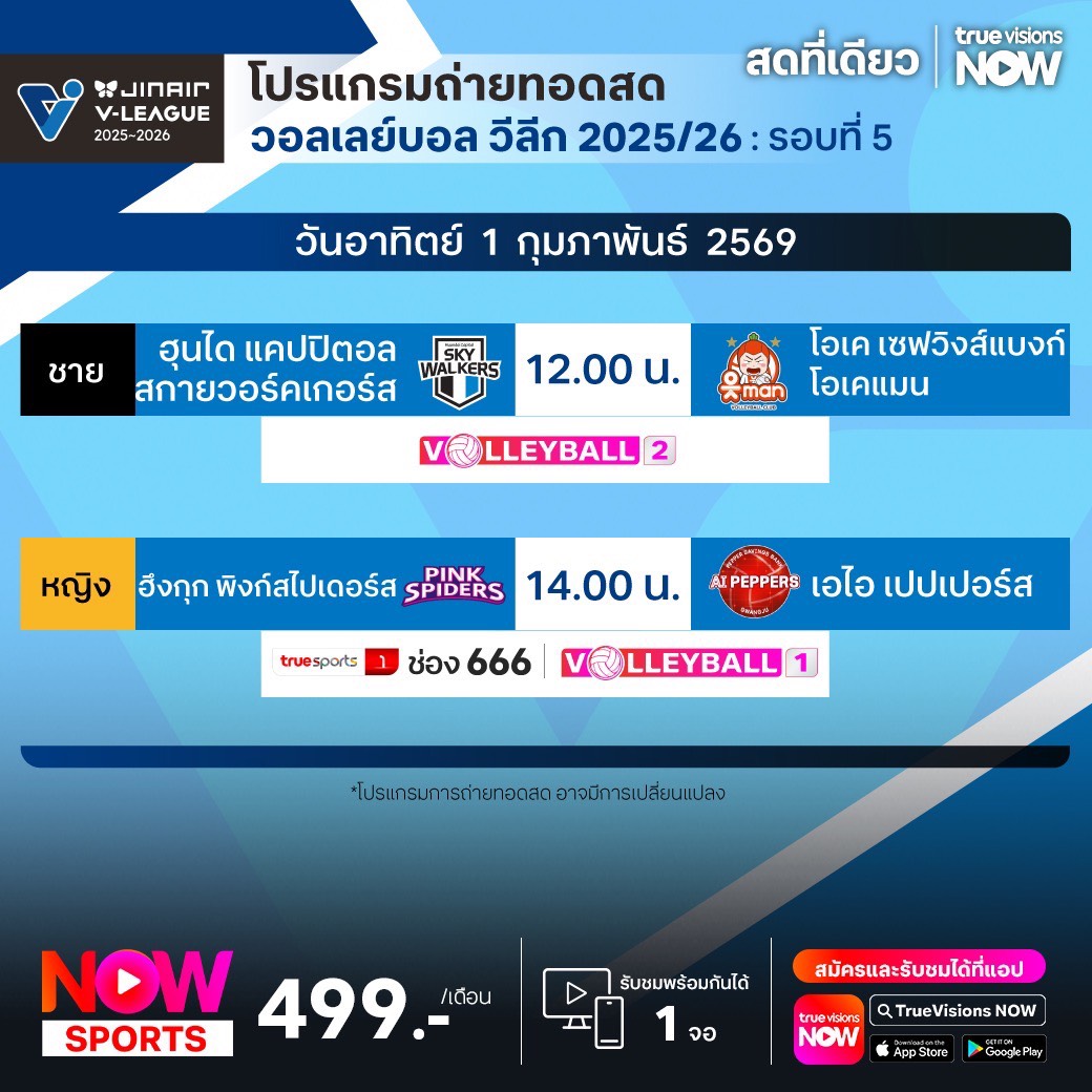 ฮึงกุก พิงก์สไปเดอร์ส พบ เอไอ เปปเปอร์ส เวลา 14.00 ทางช่อง TS 1 (666) / Volleyball 1
