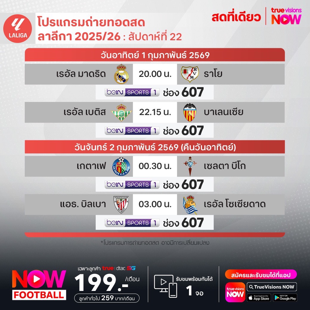 Real Betis vs Valencia เวลา 22.15-00.15 ทางช่อง beIN 1 (607)
