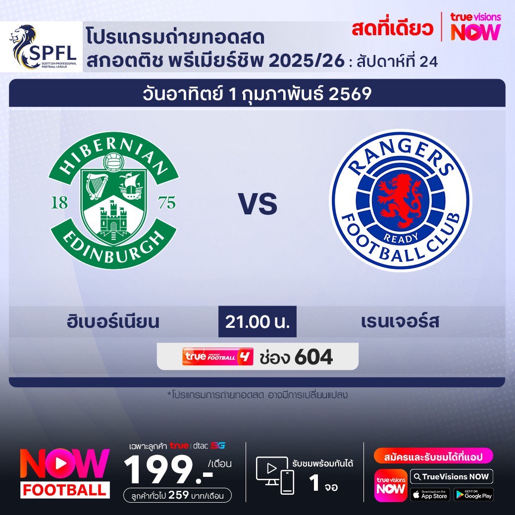 Hibernian vs Rangers เวลา 21.00-23.00 ทางช่องTPF 4(604)