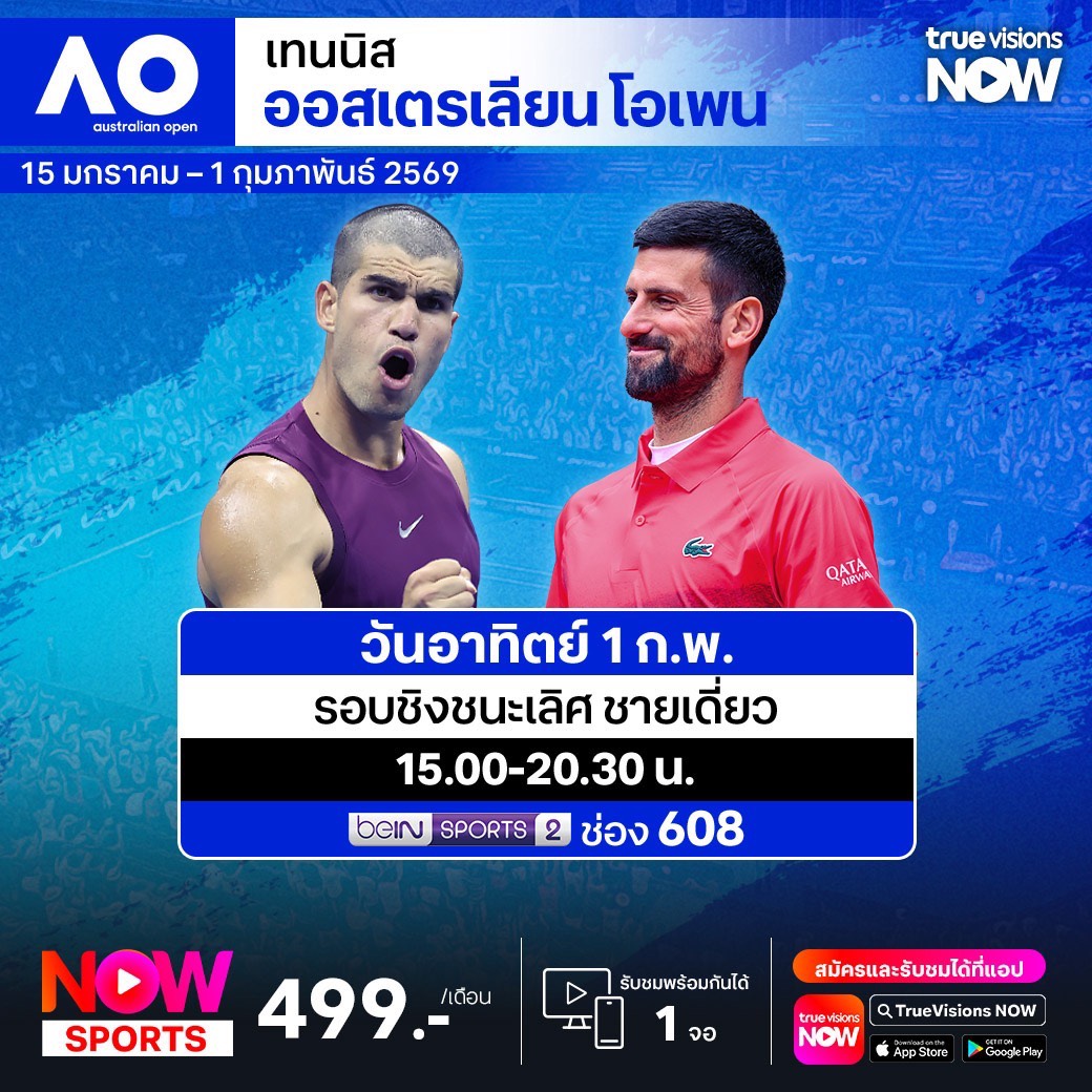 ศึกเทนนิส ออสเตรเลียน โอเพ่น แกรนด์สแลมแรกของปี 2026 เริ่มต้นอีกครั้ง กับการแข่งขันในสภาพอากาศที่ร้อนจัดของเมืองเมลเบิร์น ประเทศออสเตรเลีย เดินทางมาถึงรอบชิงชนะเลิศชายเดี่ยว ซึ่งเป็นการชิงชัยระหว่าง โนวัค ยอโควิช ปะทะ คาร์ลอส อัลการาซ ร่วมลุ้นว่าใครจะคว้าแชมป์ปีนี้ไปครอง ชมสด ที่ ทรูวิชั่นส์