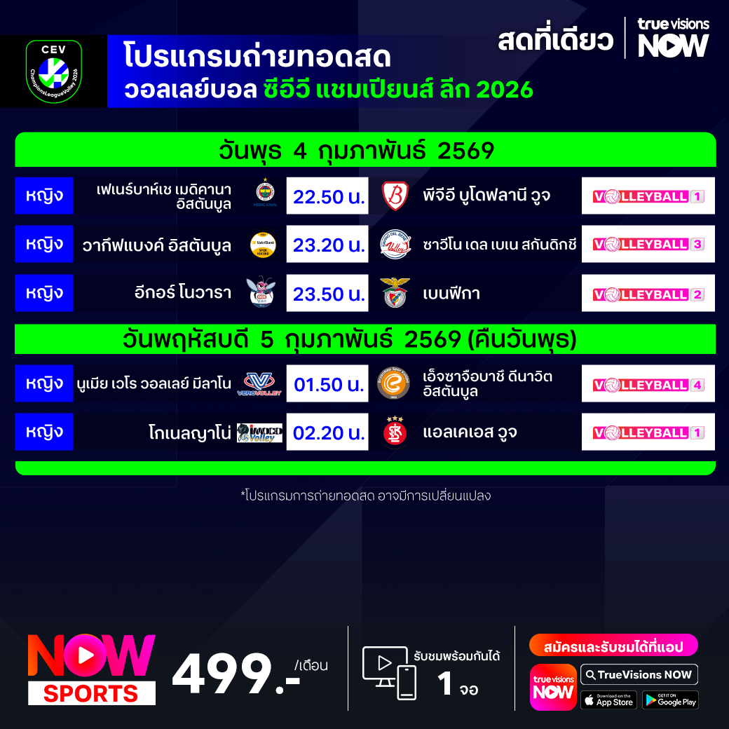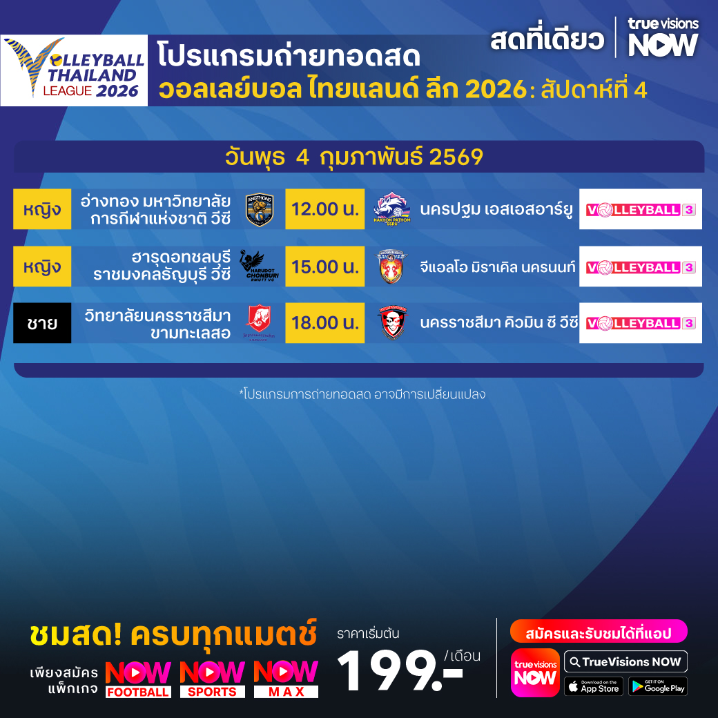 วันนี้มีอะไรดูที่ ทรูวิชั่นส์ ประจำวันพุธที่ 4 กุมภาพันธ์ 69 ยังคงมีกีฬาที่น่าสนใจให้ได้ตามลุ้นตามเชียร์กันเหมือนเดิม โดยในส่วนของฟุตบอลนั้น ยังมีศึก โคปปา อิตาเลีย, เดเอฟเบ โพคาล, สกอตติช พรีเมียร์ชิพ และ ฟุตบอลชิงแชมป์สโมสรอาเซียน ให้ได้ตามเชียร์กันต่อ ส่วนกีฬาอื่นๆ พลาดไม่ได้กับการแข่งขันโอลิมปิกฤดูหนาว 2026, เทนนิสหญิง ดับเบิ้ลยูทีเอ ทัวร์ รายการ อาบูดาบี โอเพ่น, ลิฟ กอล์ฟ ริยาดห์, เวิลด์ สนุกเกอร์ ทัวร์ รายการ เวิลด์ กรังด์ปรีซ์, แบดมินตัน เอเชีย ทีม แชมเปี้ยนชิพ, วอลเลย์บอล ซีอีวี แชมเปี้ยนส์ ลีก, วอลเลย์บอล วี-ลีก และ วอลเลย์บอล ไทยแลนด์ลีก งานนี้ ทรูวิชั่นส์ จัดเต็มให้ชมกันถึงบ้าน