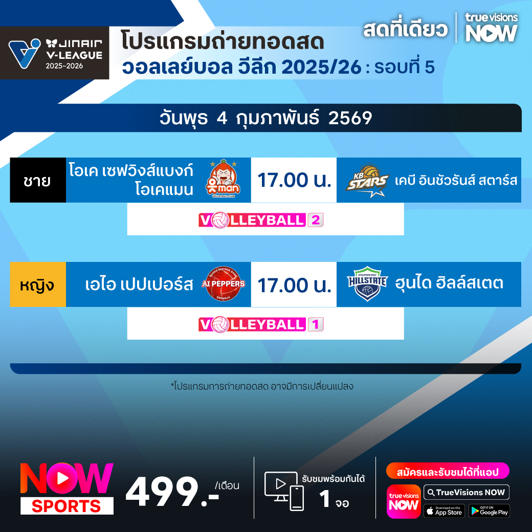 โอเค เซฟวิงส์แบงก์ โอเคแมน พบ เคบี อินชัวรันส์ สตาร์ส เวลา 17.00 ทางช่อง Volleyball 2