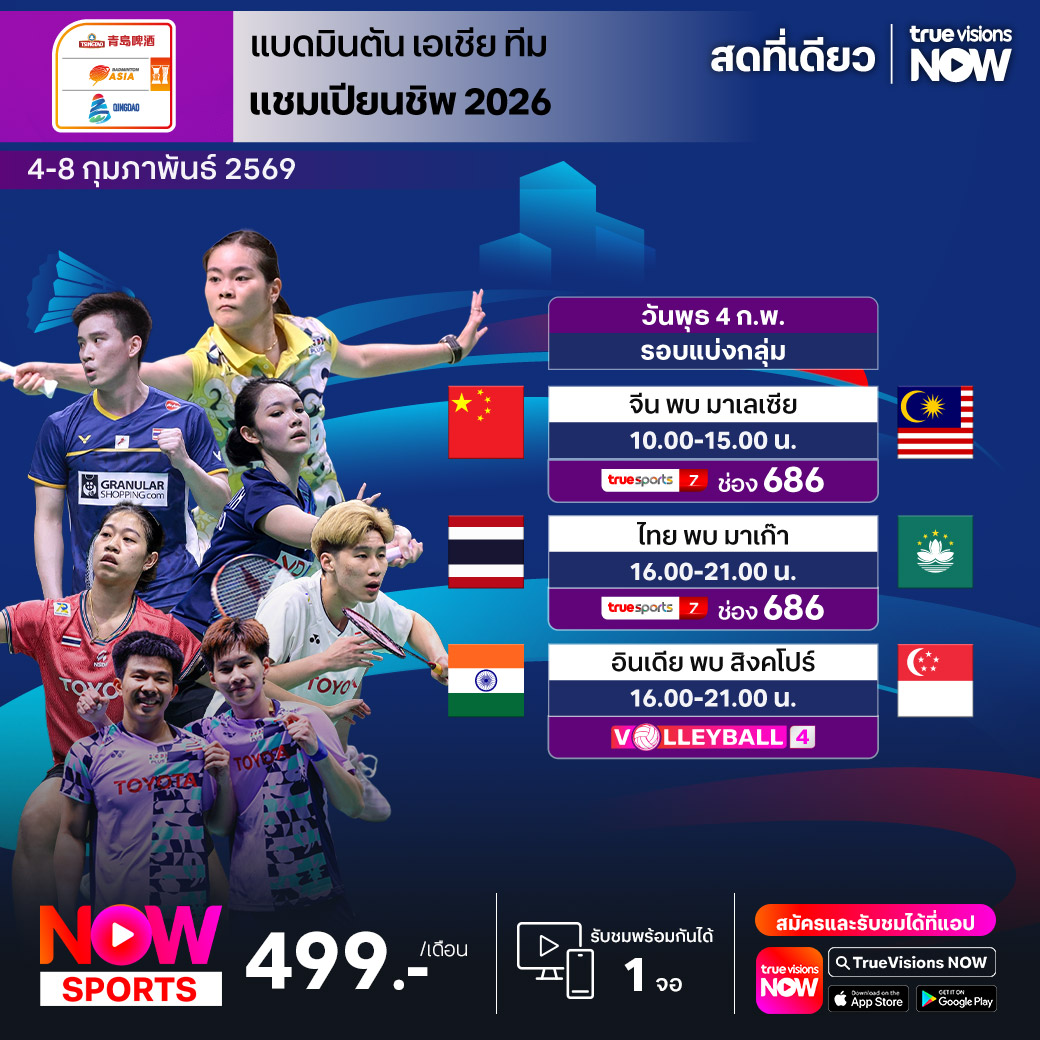 แฟนแบดมินตัน ร่วมชมเกมประเภททีมระดับชิงแชมป์ทวีป กับศึก แบดมินตัน เอเชีย ทีม แชมเปี้ยนชิพ 2026 ที่ชิงเต่า ประเทศจีน ลุ้นกันสนุก ทั้งประเภททีมชายและประเภททีมหญิง ทุกคะแนน ทุกแมตช์ มีความหมายสำหรับชัยชนะ ส่งใจเชียร์ทีมแบดมินตันไทย สู้สุดใจกับคู่แข่งมือดีจากต่างชาติ ชมสด ที่ ทรูวิชั่นส์