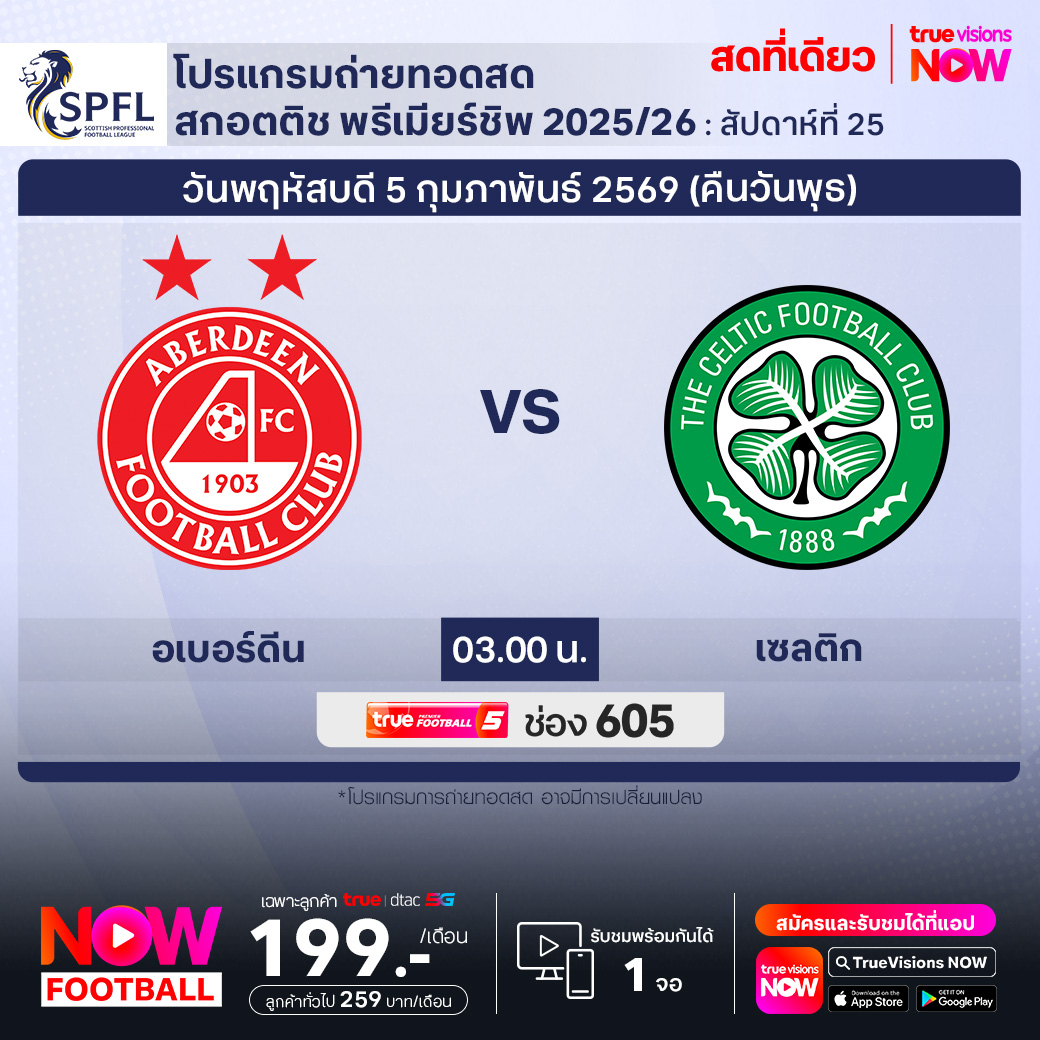 Aberdeen vs Celtic เวลา 03.00-05.00 ทางช่องTPF 5(605)