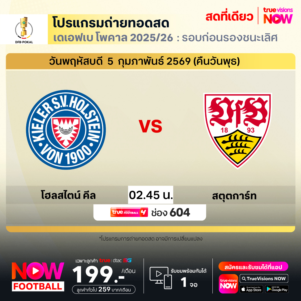 Holstein Kiel vs Stuttgart เวลา 02.45-04.45 ทางช่องTPF 4(604)