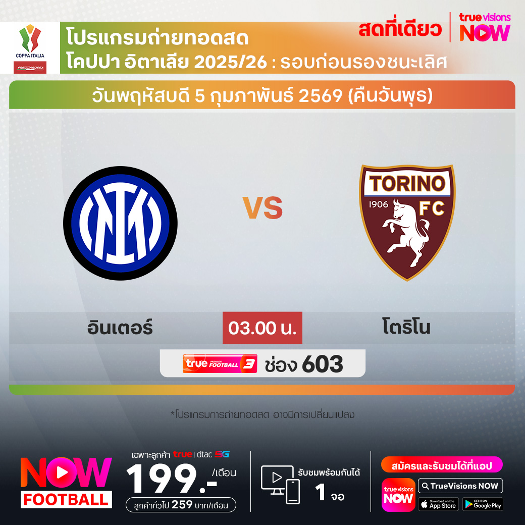 Inter vs Torino เวลา 03.00-05.00 ทางช่องTPF 3(603)