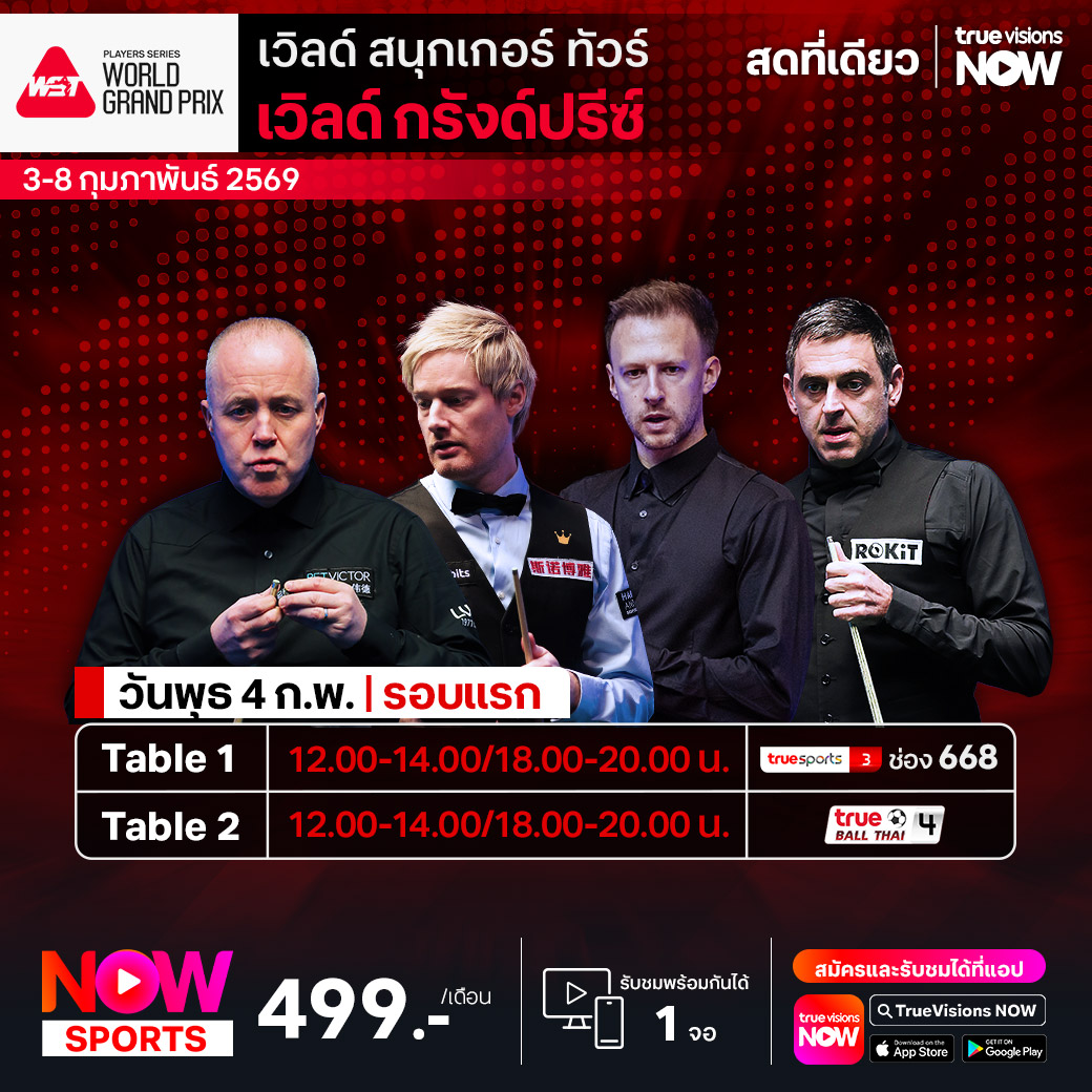 เวิลด์ สนุกเกอร์ ทัวร์ รายการเก็บคะแนนสะสมโลก สัปดาห์นี้พบกับรายการ เวิลด์ กรังด์ปรีซ์ หนึ่งใน 3 ของ เพลย์เยอร์ส ซีรี่ส์ ที่ระดมเอามือแทงระดับพระกาฬของโลก 32 คน มาดวลคิวที่สนามแข่งที่ทันสมัยและจุผู้ชมมหาศาลอย่าง ไคตั๊ก อารีน่า ร่วมลุ้นกันว่า ใครจะแม่นกว่า แน่นอนกว่า และกลับบ้านด้วยโทรฟี่แชมเปี้ยนส์ ชมสด ครบทุกรอบที่ ทรูวิชั่นส์