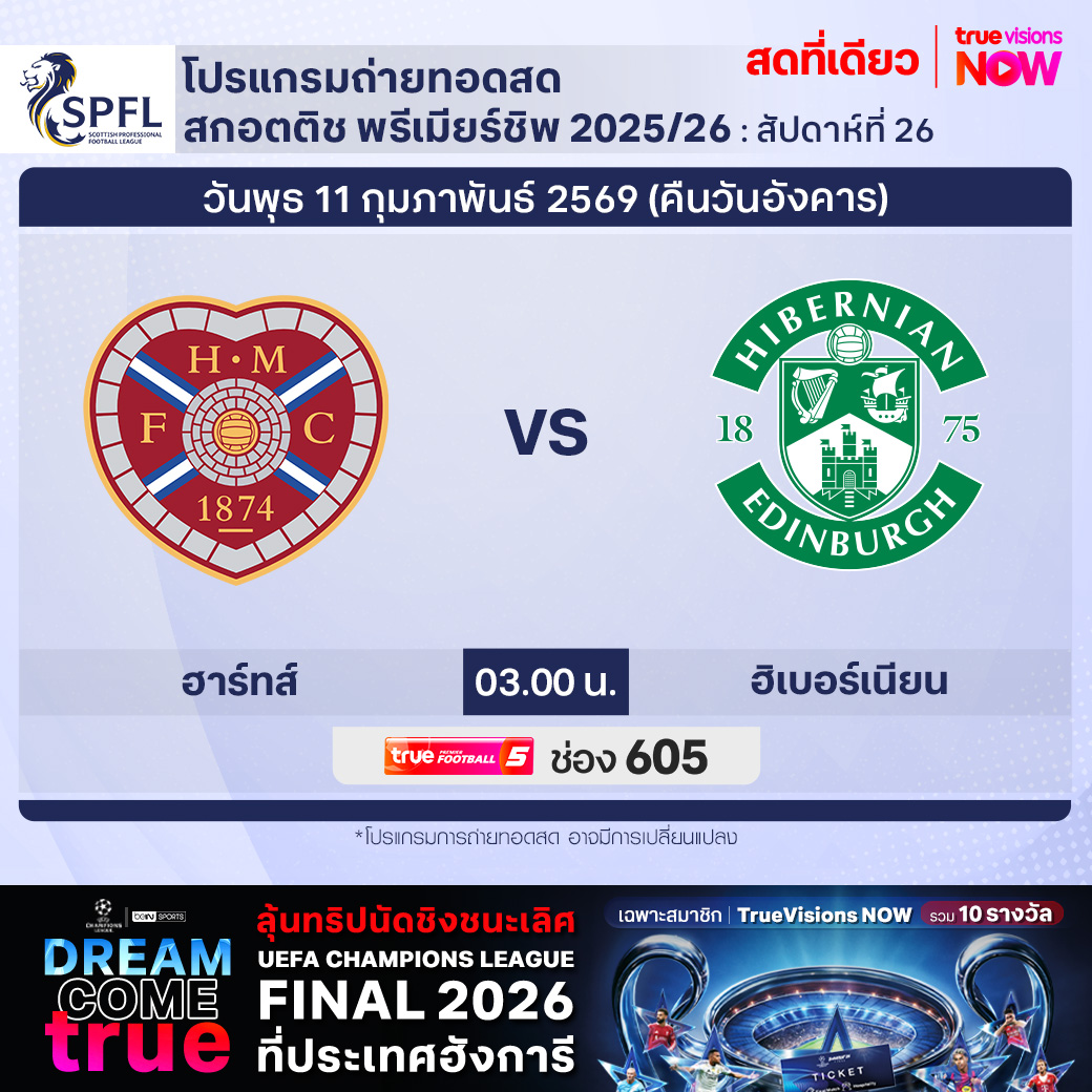 Heart of Midlothian vs Hibernian เวลา 03.00-05.00 ทางช่องTPF 5(605)