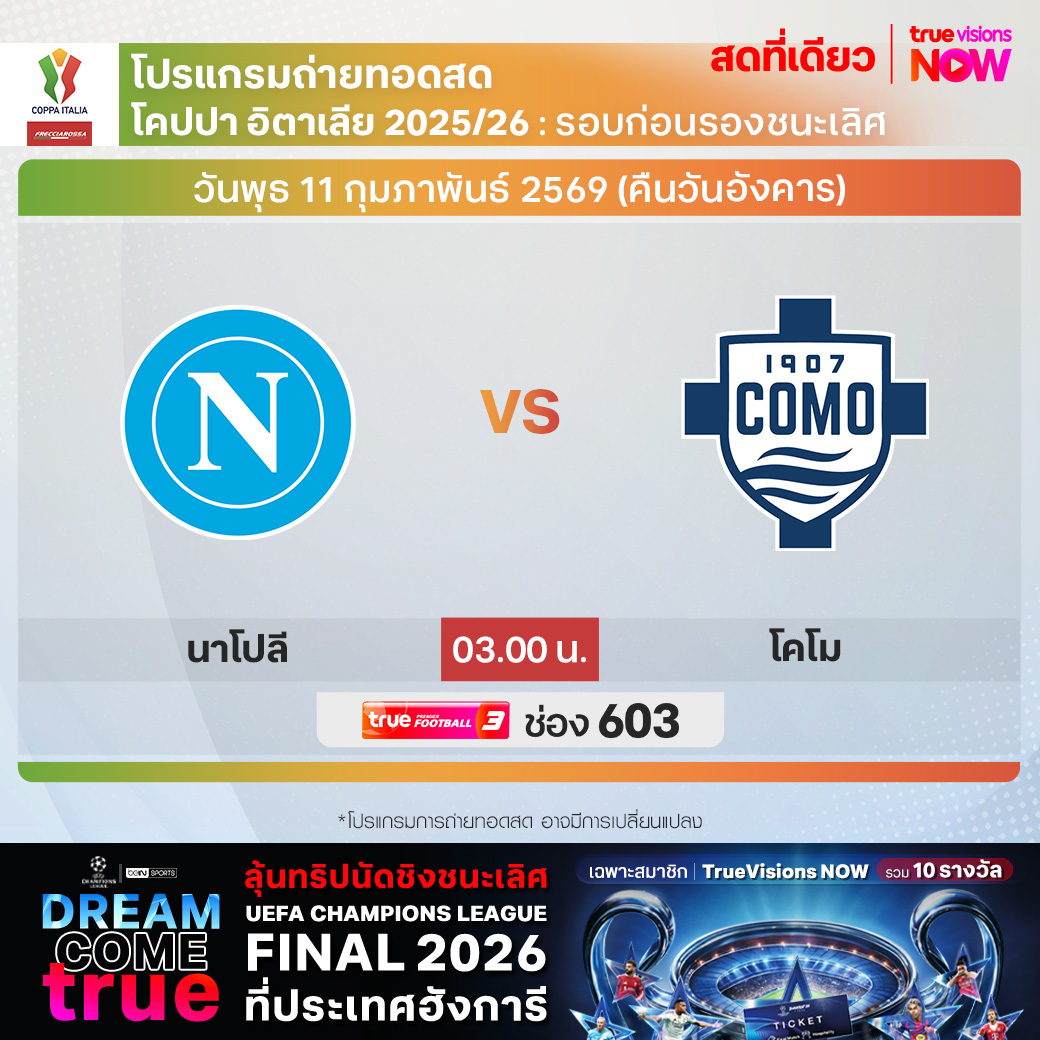 Napoli vs Como เวลา 03.00-05.00 ทางช่องTPF 3(603)