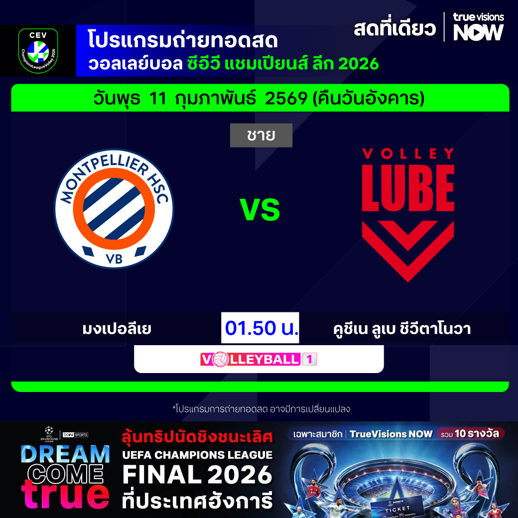 มงเปอลีเย พบ คูชีเน ลูเบ ชีวีตาโนวา เวลา 01.50 ทางช่อง Volleyball 1