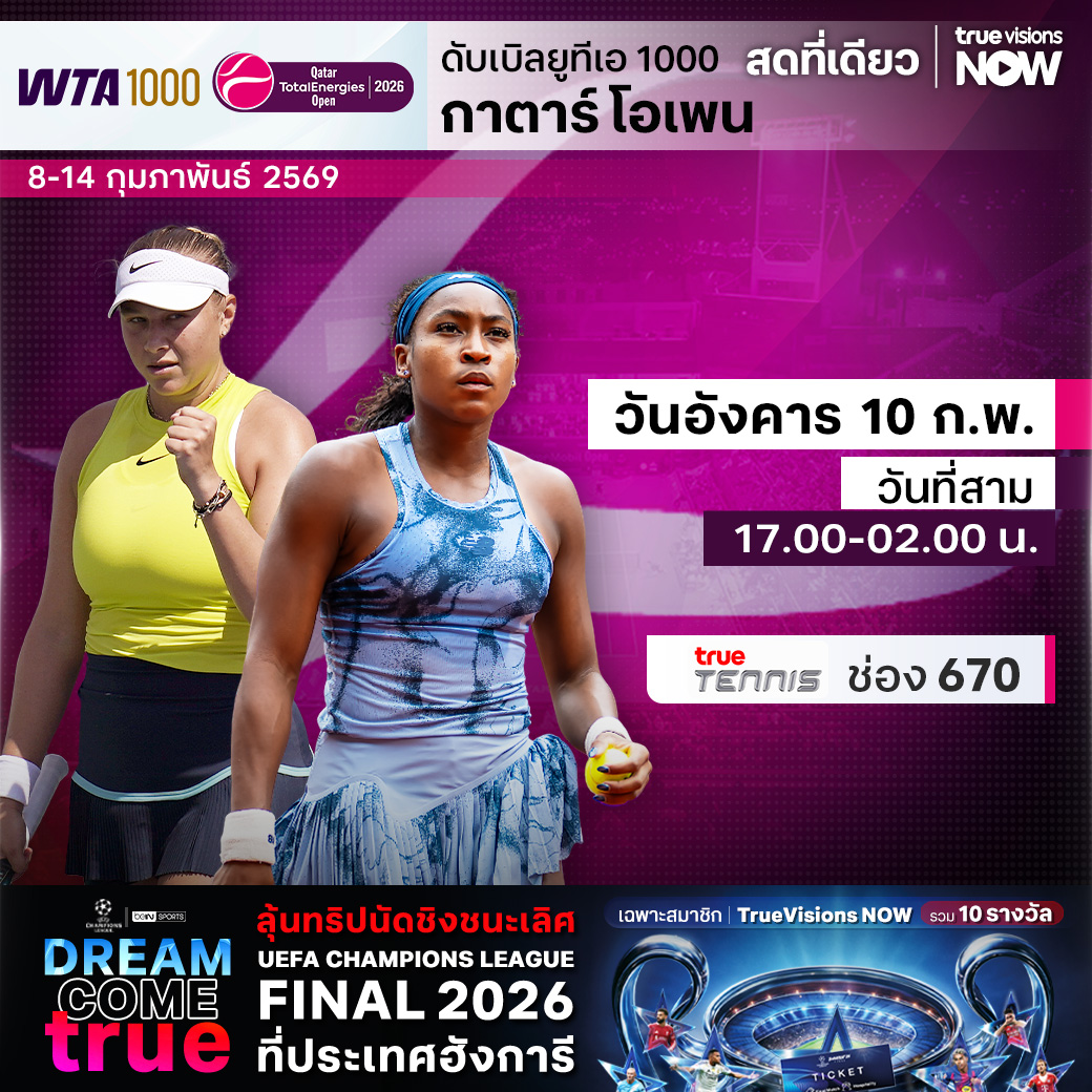 เทนนิสหญิง ดับเบิ้ลยูทีเอ ทัวร์ เข้าสู่ช่วงรายการแข่งขันที่ตะวันออกกลาง ต่อเนื่องกันที่กรุงโดฮา ประเทศการ์ตา กับรายการใหญ่ระดับ WTA 1000 ในรายการ การ์ตา โอเพ่น มีนักกีฬาเทนนิสหญิงระดับโลกเข้าร่วมการแข่งขันกันคับคั่ง ร่วมลุ้นกันว่าใครจะคว้าแชมป์ไปครอง ชมสด ครบทุกรอบ ที่ ทรูวิชั่นส์