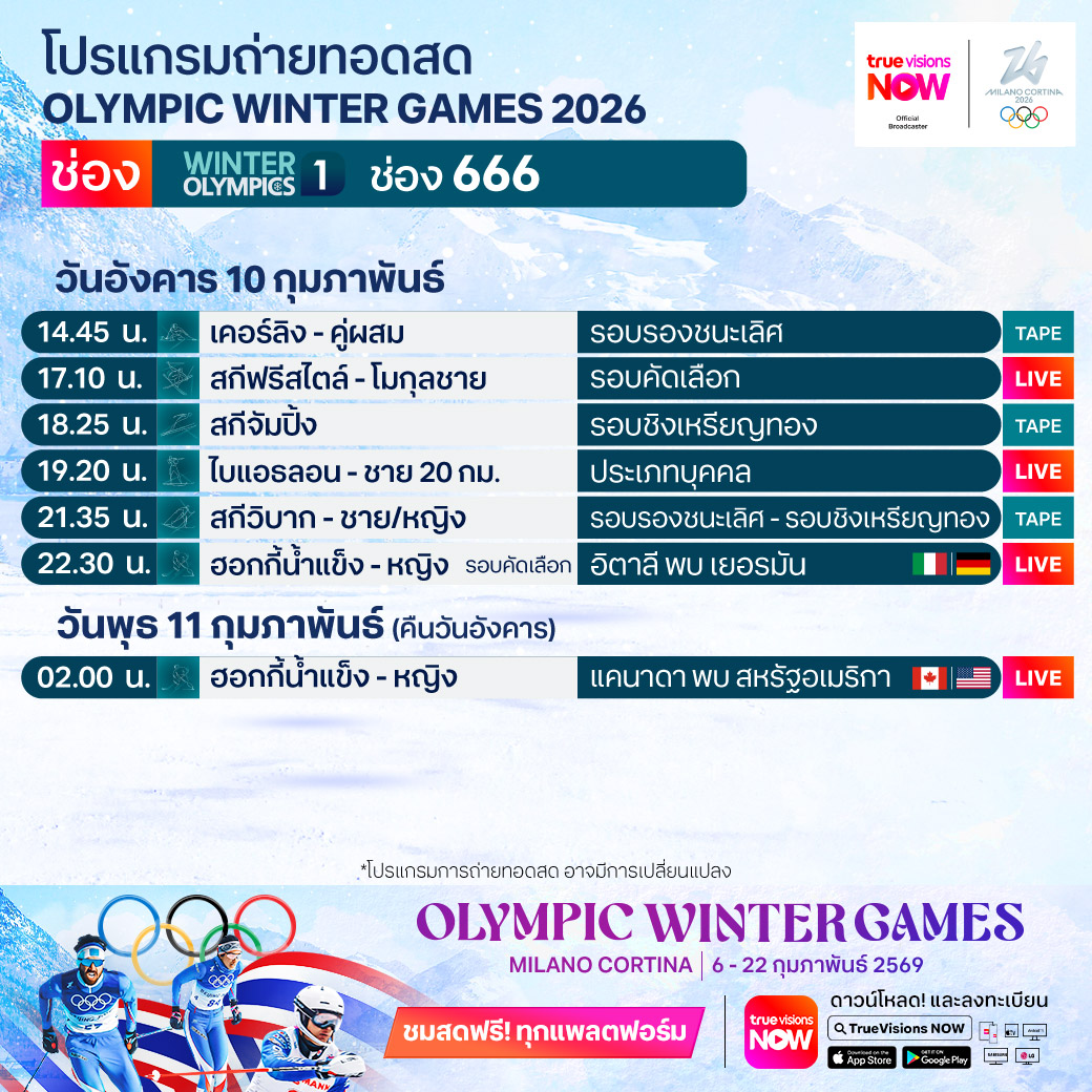 วันนี้มีอะไรดูที่ ทรูวิชั่นส์ ประจำวันอังคารที่ 10 กุมภาพันธ์ 69 ยังคงมีกีฬาที่น่าสนใจให้ได้ตามลุ้นตามเชียร์กันเหมือนเดิม โดยในส่วนของฟุตบอลนั้น ยังมีศึก โคปปา อิตาเลีย, เดเอฟเบ โพคาล และ สกอตติช พรีเมียร์ชิพ ให้ได้ตามเชียร์กันต่อ ส่วนกีฬาอื่นๆ พลาดไม่ได้กับการแข่งขันโอลิมปิกฤดูหนาว 2026, เทนนิสหญิง ดับเบิ้ลยูทีเอ ทัวร์ รายการ กาตาร์ โอเพ่น, กอล์ฟ ทูมอร์โรว์ กอล์ฟ ลีก, วอลเลย์บอล ซีอีวี แชมเปี้ยนส์ ลีก และ วอลเลย์บอล วี-ลีก งานนี้ ทรูวิชั่นส์ จัดเต็มให้ชมกันถึงบ้าน