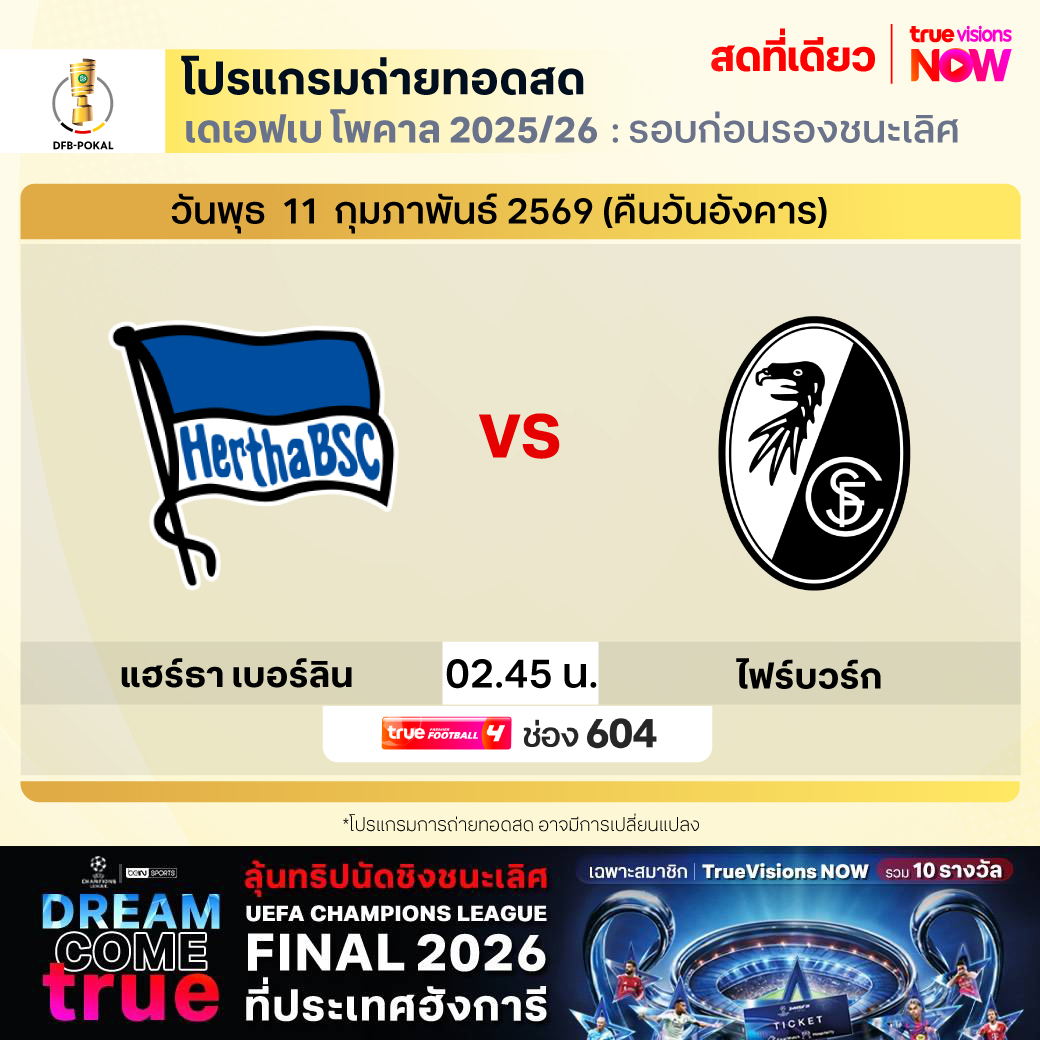 Hertha Berlin vs Freiburg เวลา 02.45-04.45 ทางช่องTPF 4(604)