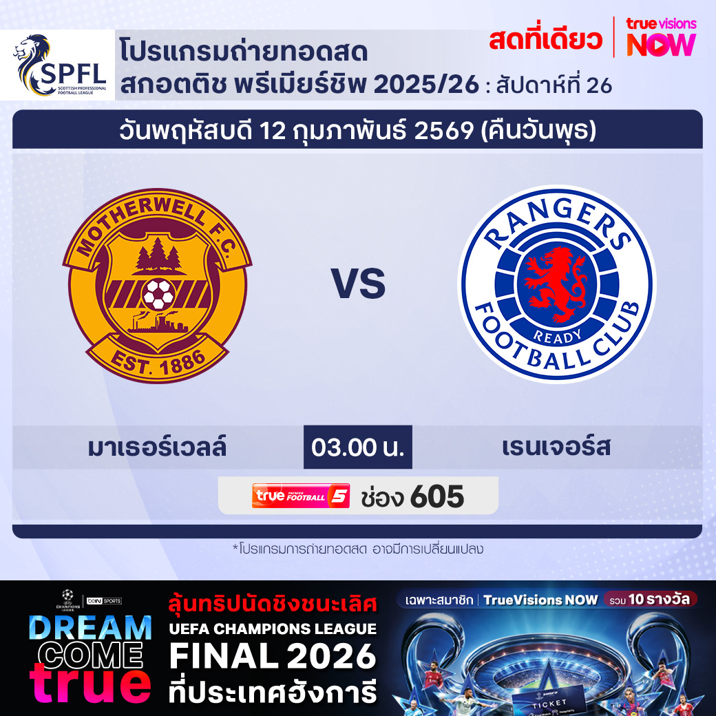 Motherwell vs Rangers เวลา 03.00-05.00 ทางช่องTPF 5(605)