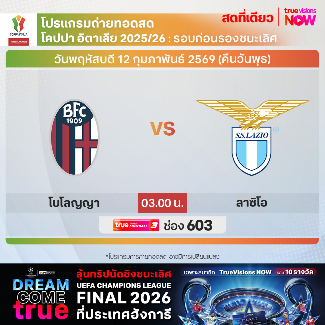วันนี้มีอะไรดูที่ ทรูวิชั่นส์ ประจำวันพุธที่ 11 กุมภาพันธ์ 69 ยังคงมีกีฬาที่น่าสนใจให้ได้ตามลุ้นตามเชียร์กันเหมือนเดิม โดยในส่วนของฟุตบอลนั้น ยังมีศึก โคปปา อิตาเลีย, เดเอฟเบ โพคาล และ สกอตติช พรีเมียร์ชิพ ให้ได้ตามเชียร์กันต่อ ส่วนกีฬาอื่นๆ พลาดไม่ได้กับการแข่งขันโอลิมปิกฤดูหนาว 2026, ฟอร์มูล่า วัน 2026 ปรี ซีซั่น, เทนนิสหญิง ดับเบิ้ลยูทีเอ ทัวร์ รายการ กาตาร์ โอเพ่น, วอลเลย์บอล ซีอีวี แชมเปี้ยนส์ ลีก และ วอลเลย์บอล วี-ลีก งานนี้ ทรูวิชั่นส์ จัดเต็มให้ชมกันถึงบ้าน