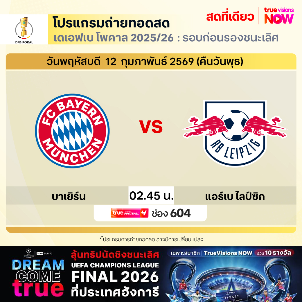 Bayern vs RB Leipzig เวลา 02.45-04.45 ทางช่องTPF 4(604)