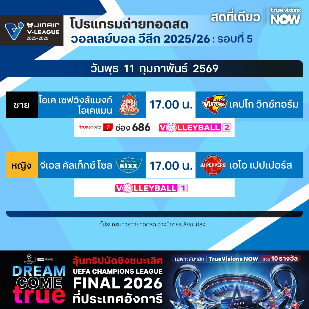 โอเค เซฟวิงส์แบงก์ โอเคแมน พบ เคปโก วิกซ์ทอร์ม เวลา 17.00 ทางช่อง TS 7 (686) / Volleyball 2