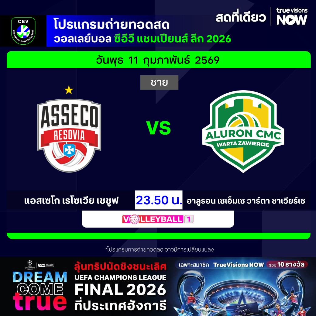 แอสเซโก เรโซเวีย เชชูฟ พบ อาลูรอน เซเอ็มเซ วาร์ตา ซาเวียร์เช เวลา 23.50 ทางช่อง Volleyball 1