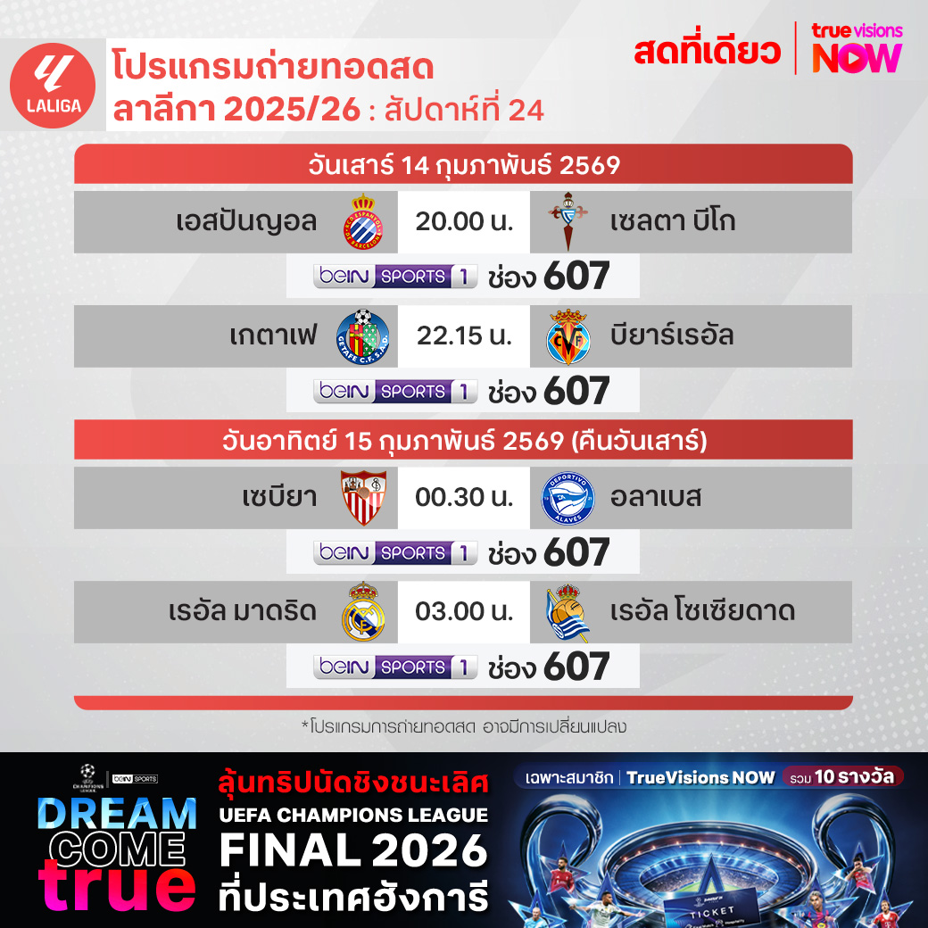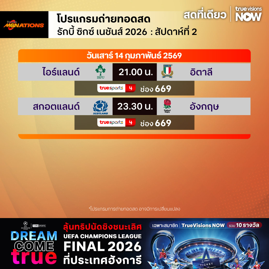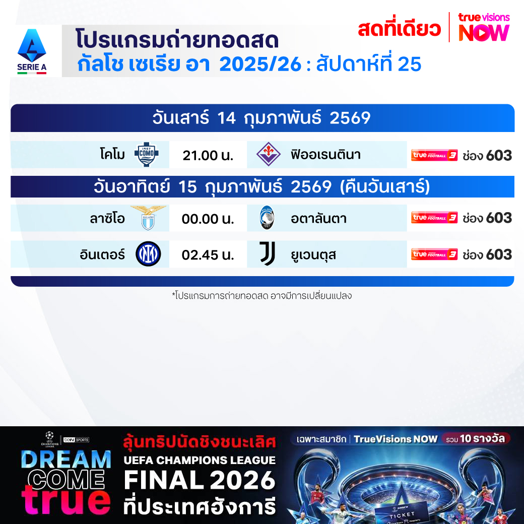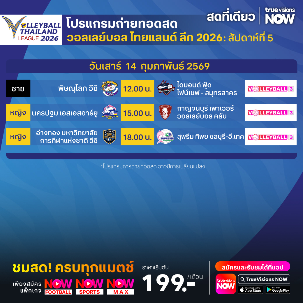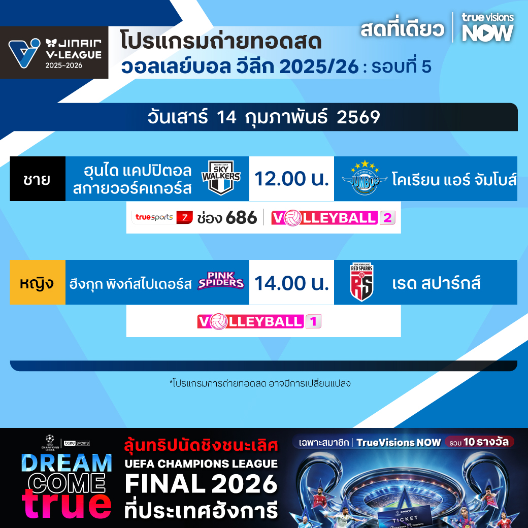 วันนี้มีอะไรดูที่ ทรูวิชั่นส์ ประจำวันเสาร์ที่ 14 กุมภาพันธ์ 69 ยังคงมีกีฬาที่น่าสนใจให้ได้ตามลุ้นตามเชียร์กันเหมือนเดิม โดยในส่วนของฟุตบอลยังมีศึก ลา ลีกา สเปน, บุนเดสลีกา เยอรมนี, กัลโช่ เซเรีย อา อิตาลี, ลีกา 2 เยอรมนี และ ซาอุดิ โปร ลีก ให้ได้ตามเชียร์กันต่อ ส่วนกีฬาอื่นๆ ยังมีการแข่งขันโอลิมปิกฤดูหนาว 2026, เทนนิสหญิง ดับเบิ้ลยูทีเอ ทัวร์ รายการ กาตาร์ โอเพ่น, ลิฟ กอล์ฟ แอดิเลด, กอล์ฟหญิง เลดี้ส์ ยูโรเปี้ยน ทัวร์ รายการ ซาอุดิ เลดี้ส์ อินเตอร์เนชั่นแนล, แบดมินตัน ทีมชายและทีมหญิง ชิงแชมป์ยุโรป, รักบี้ ซิกซ์ เนชั่นส์, มวยไทย ศึกเกียรติเพชร ซูเปอร์ไฟท์, วอลเลย์บอล วี-ลีก และ วอลเลย์บอล ไทยแลนด์ ลีก งานนี้ ทรูวิชั่นส์ จัดเต็มให้ชมกันถึงบ้าน