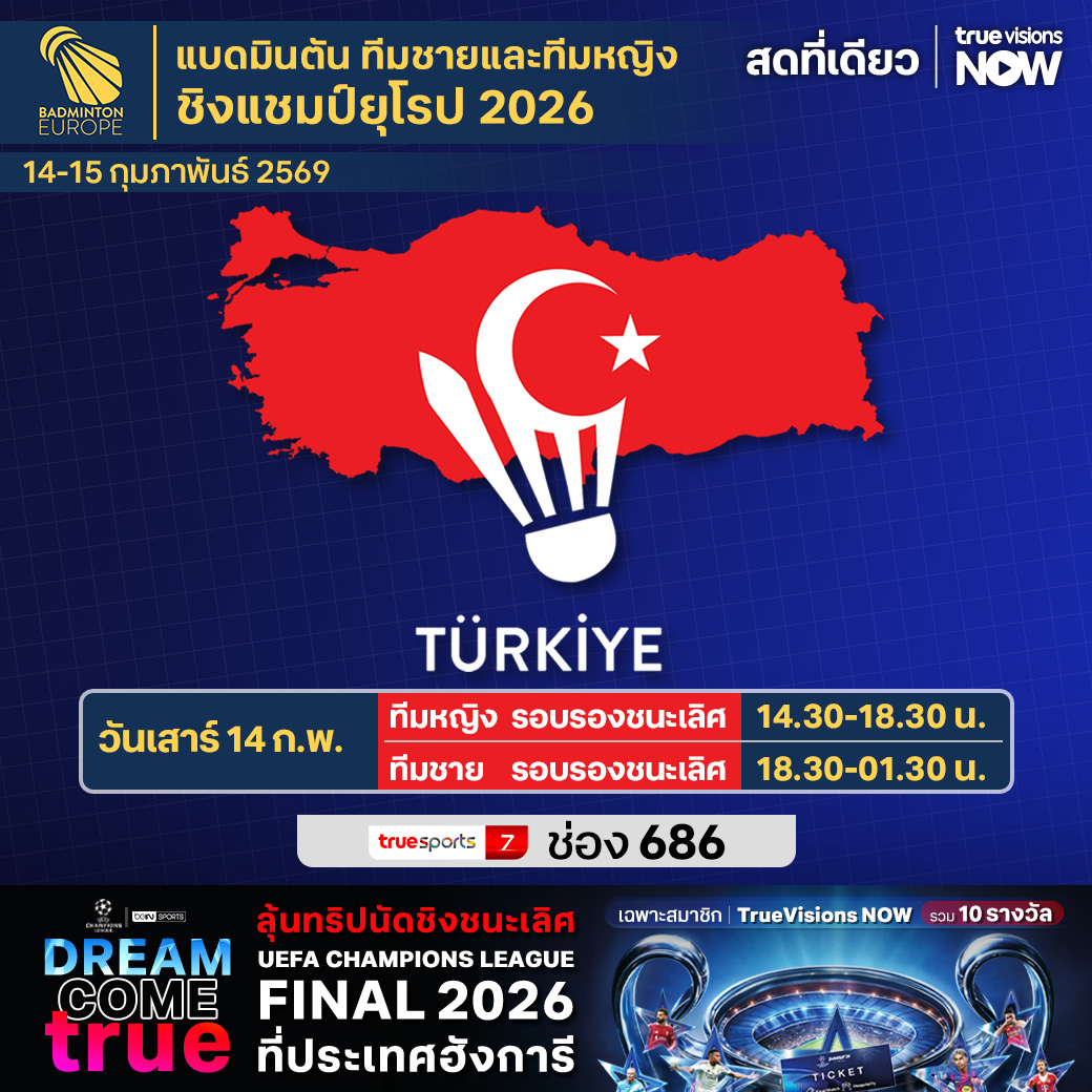 ศึกใหญ่ระดับชิงแชมป์ทวีป ที่แฟนๆ แบดมินตันต้องติดตามกันให้ได้ เกมที่ดุเดือด เร้าใจ และใส่กันไม่ยั้ง สัปดาห์นี้ พบกับการแข่งขันแบดมินตันทีมชายและทีมหญิง ชิงแชมป์ยุโรป 2026 ที่จะเป็นการพิสูจน์ว่าชาติใดจะแย่งชิงความยิ่งใหญ่จากเดนมาร์ก ที่กวาดความสำเร็จมาครอบครองหลายสมัยติดต่อกันในช่วงหลังๆ ชมสด เอ็กซ์คลูซีฟ จากกรุงอิสตันบูล ประเทศตุรกี